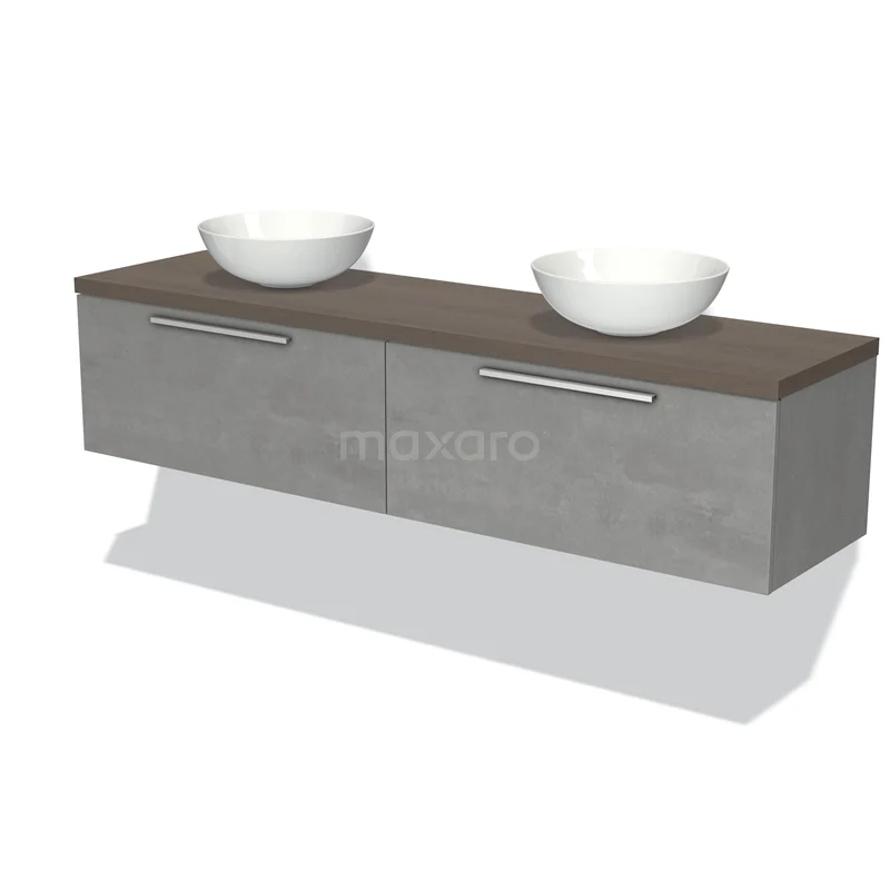 Modulo Plato Badmöbel mit Aufsatzwaschbecken | 180 cm Hellgrauer Beton Flach front Dunkelbraune Eiche blatt 2 nebeneinanderliegende Schubladen