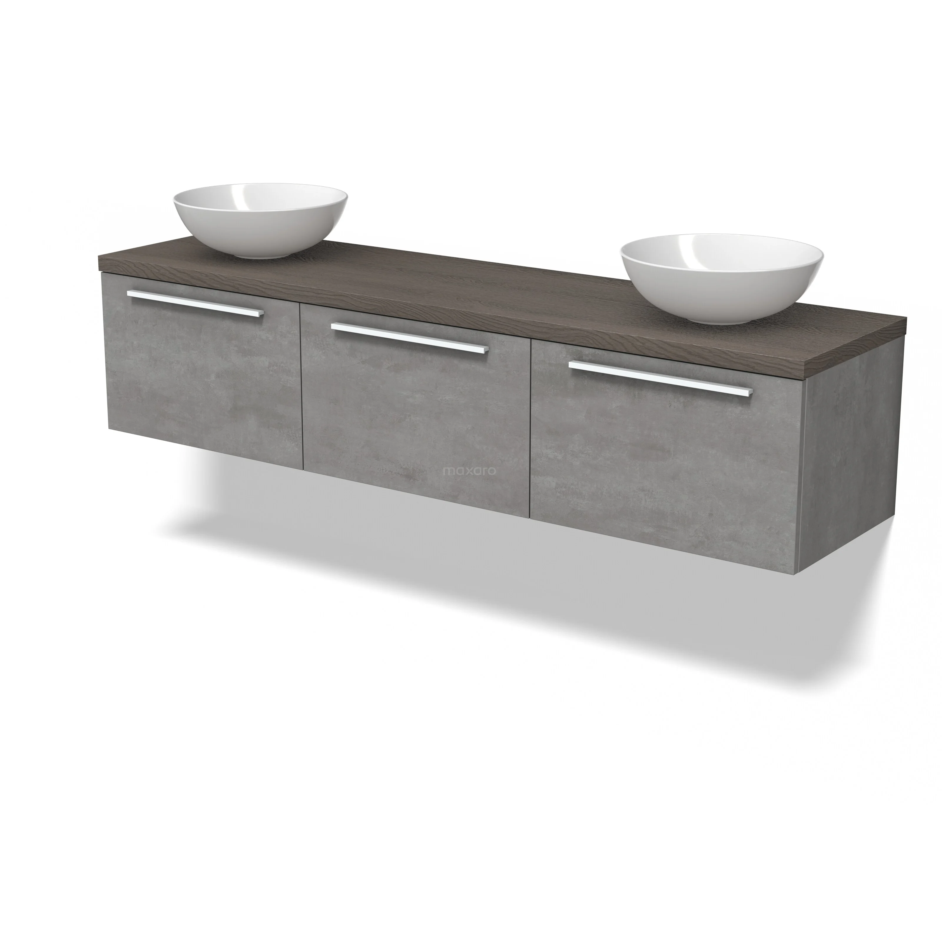 Modulo Plato Badmöbel mit Aufsatzwaschbecken | 180 cm Hellgrauer Beton Flach front Dunkelbraune Eiche blatt 3 nebeneinanderliegende Schubladen