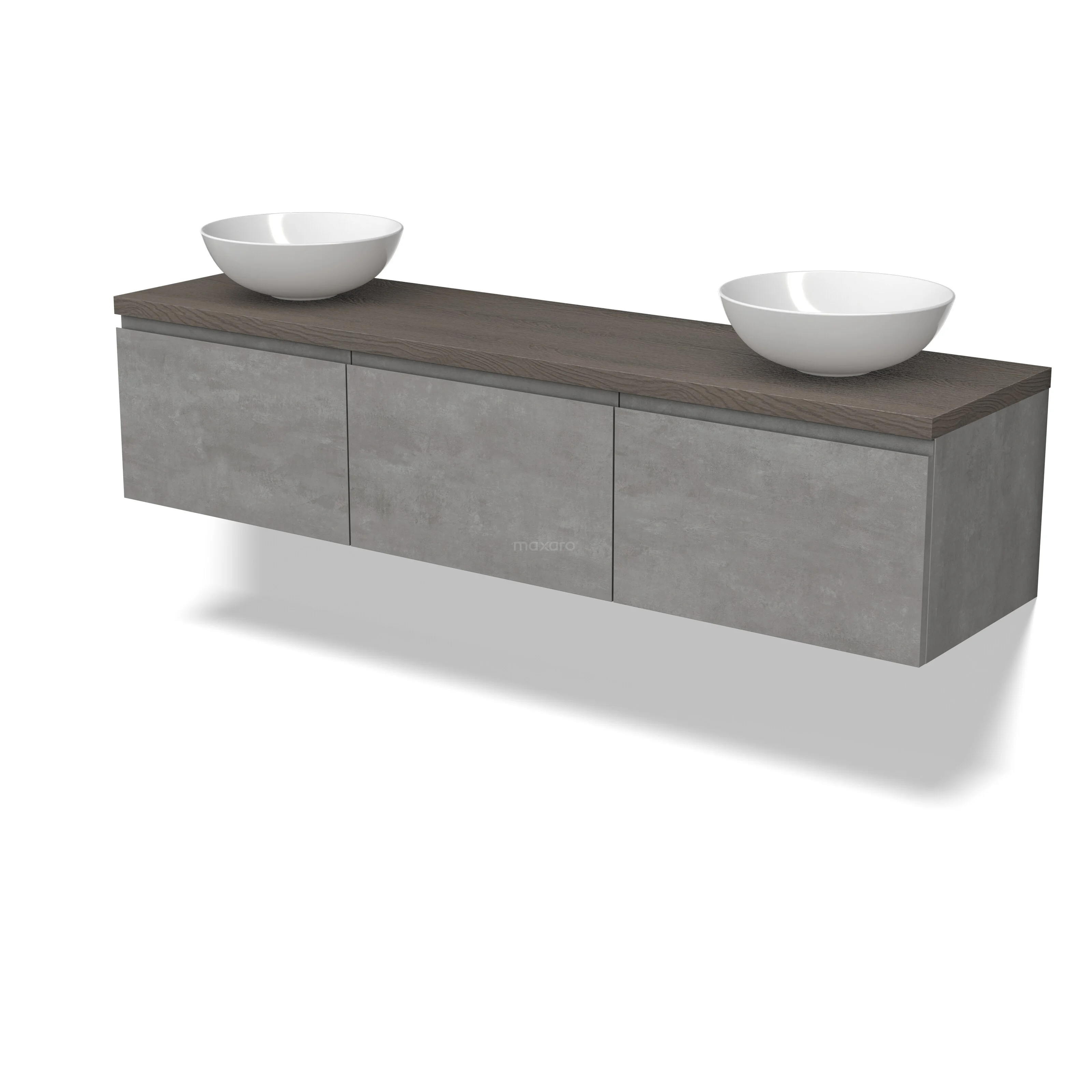 Modulo Plato Badmöbel mit Aufsatzwaschbecken | 180 cm Hellgrauer Beton Grifflos front Dunkelbraune Eiche blatt 3 nebeneinanderliegende Schubladen