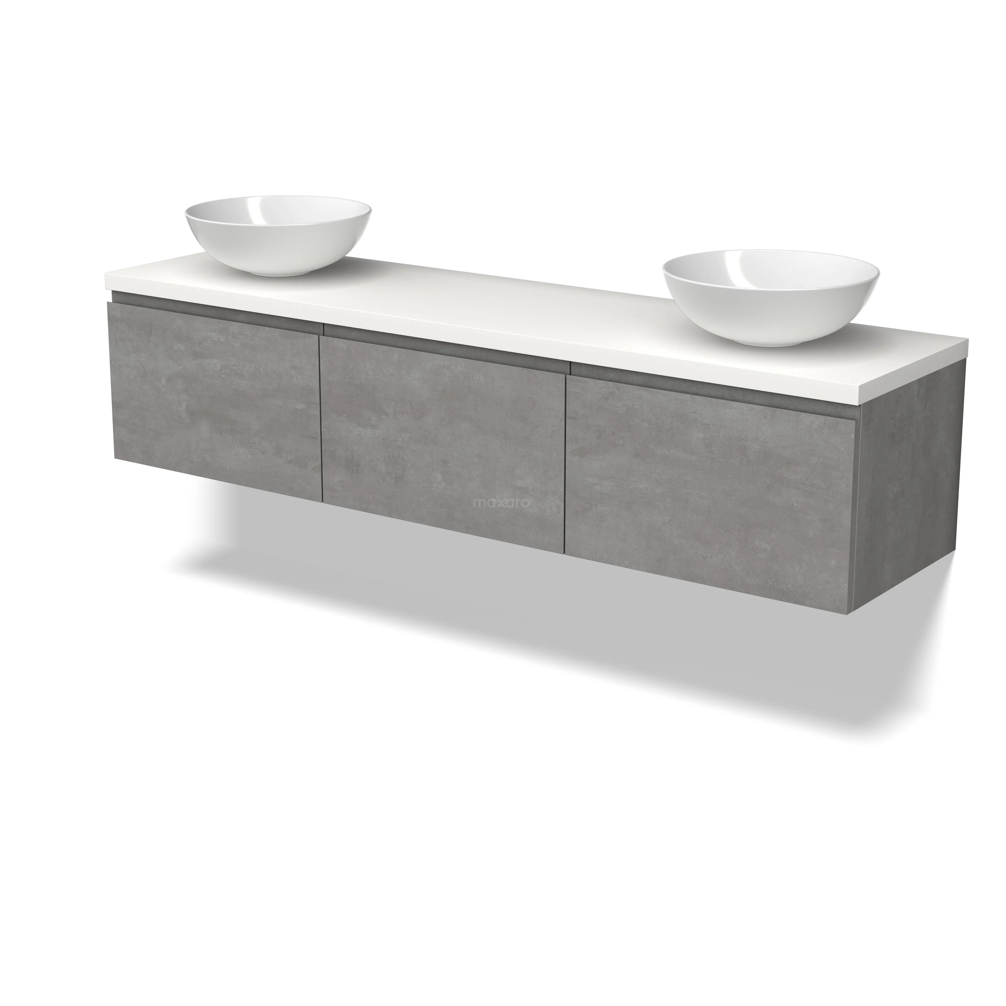 Modulo Plato Badmöbel mit Aufsatzwaschbecken | 180 cm Hellgrauer Beton Grifflos front Matt Weiß blatt 3 nebeneinanderliegende Schubladen