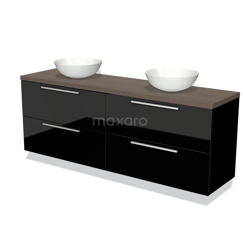 Modulo Plato Badmöbel mit Aufsatzwaschbecken | 180 cm Hochglanz Schwarz Flach front Dunkelbraune Eiche blatt 4 Schubladen