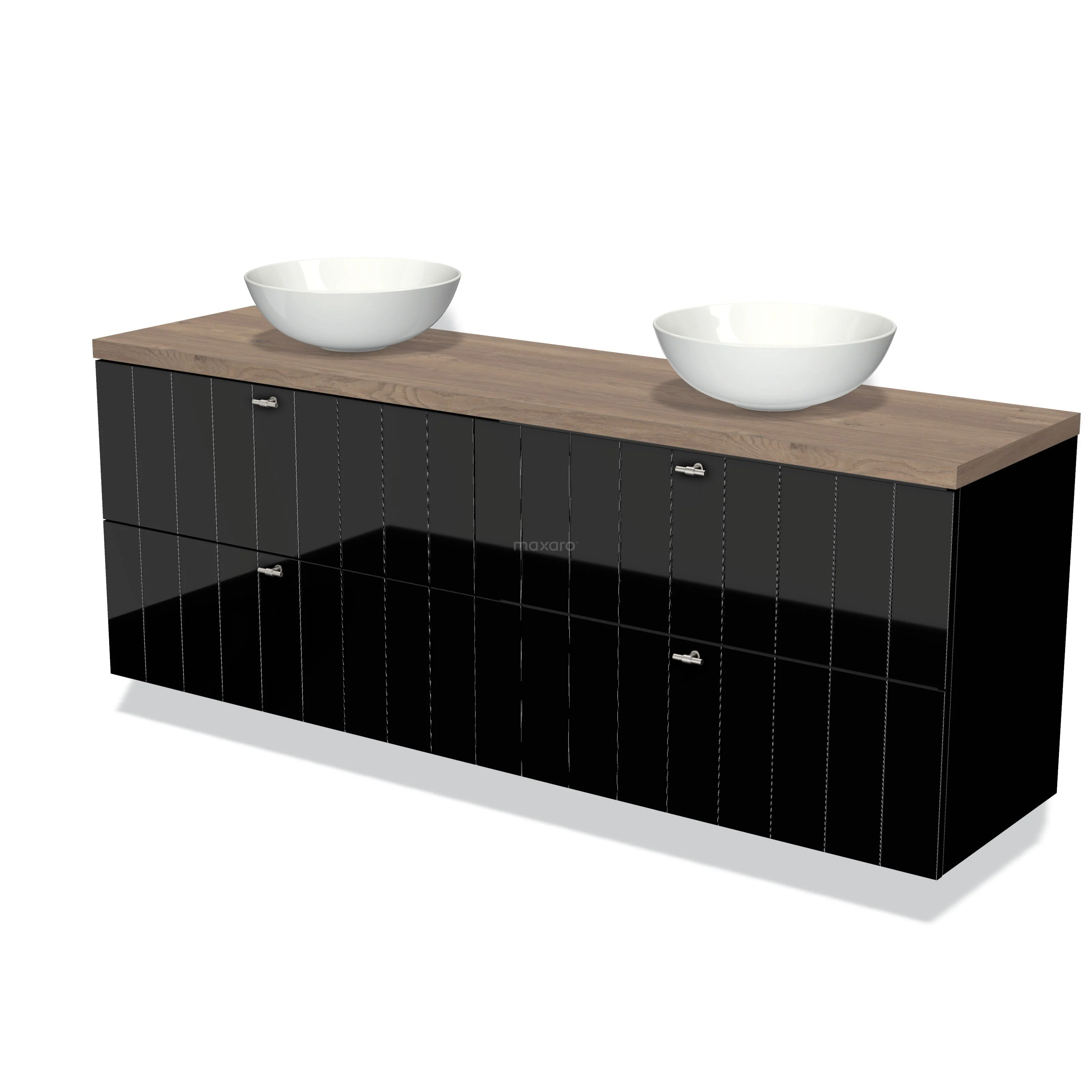 Modulo Plato Badmöbel mit Aufsatzwaschbecken | 180 cm Hochglanz Schwarz Lamelle front Mittelbraune Eiche blatt 4 Schubladen
