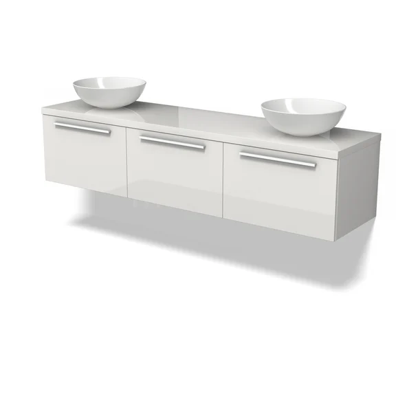 Modulo Plato Badmöbel mit Aufsatzwaschbecken | 180 cm Hochglanz Weiß Flach front Hochglanz Weiß blatt 3 nebeneinanderliegende Schubladen