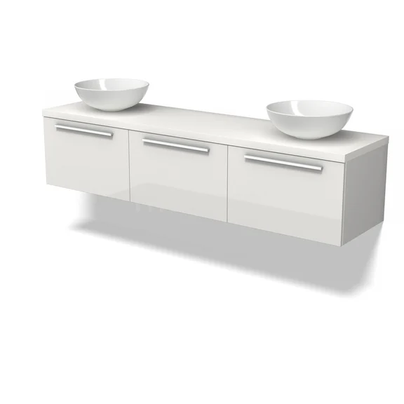 Modulo Plato Badmöbel mit Aufsatzwaschbecken | 180 cm Hochglanz Weiß Flach front Matt Weiß blatt 3 nebeneinanderliegende Schubladen