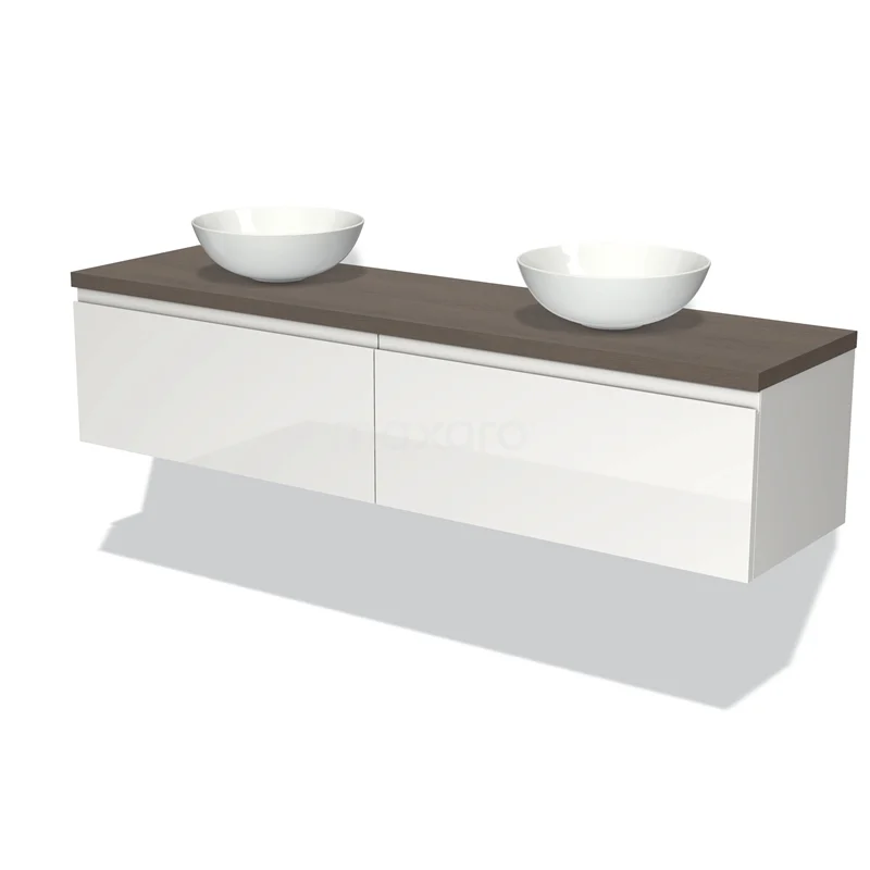Modulo Plato Badmöbel mit Aufsatzwaschbecken | 180 cm Hochglanz Weiß Grifflos front Dunkelbraune Eiche blatt 2 nebeneinanderliegende Schubladen