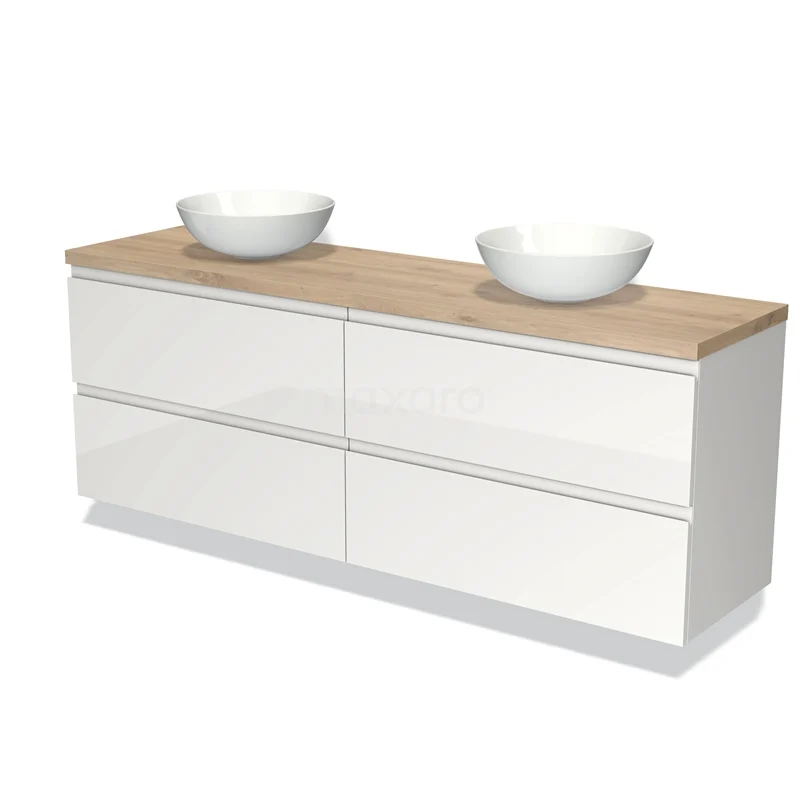 Modulo Plato Badmöbel mit Aufsatzwaschbecken | 180 cm Hochglanz Weiß Grifflos front Hellbraune Eiche blatt 4 Schubladen