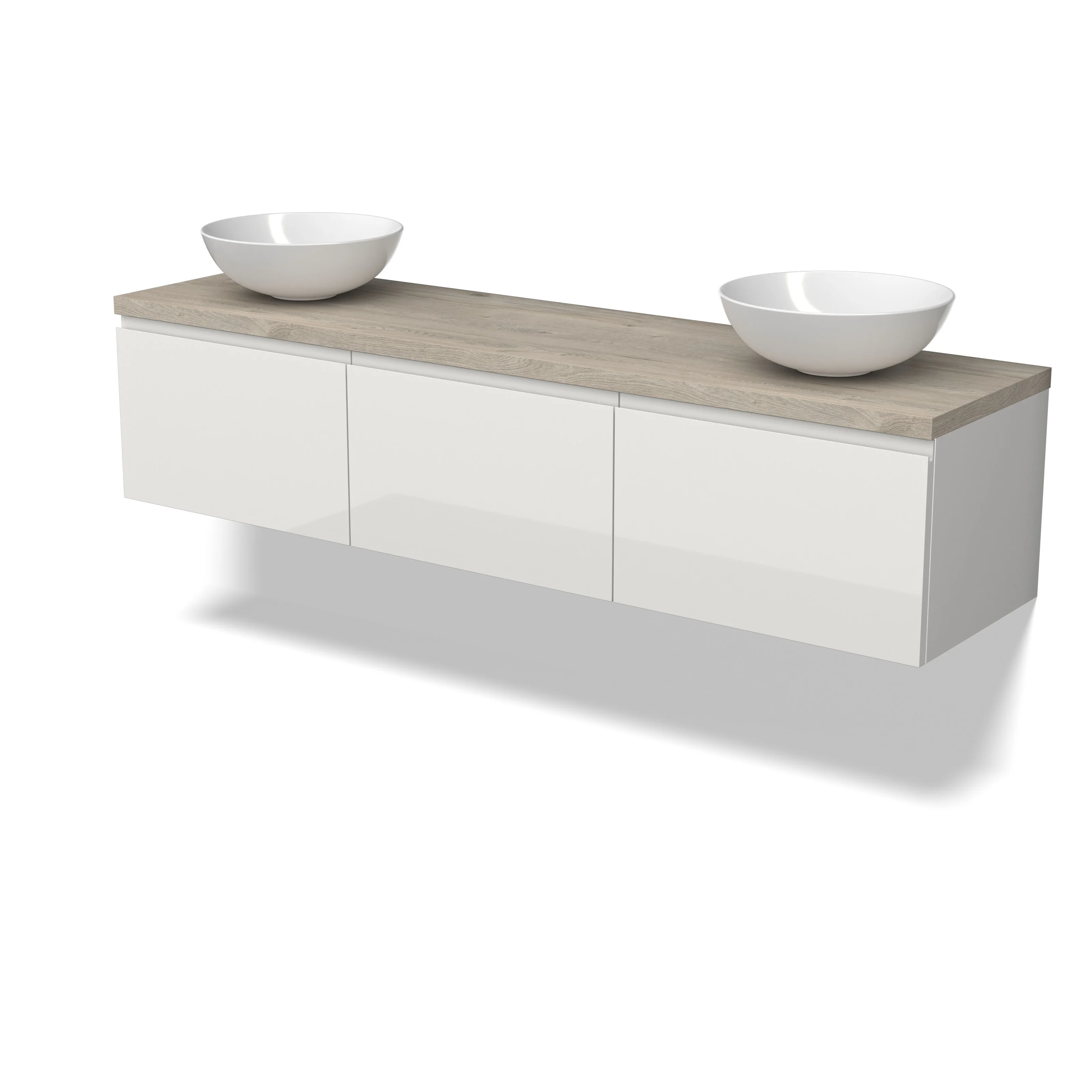 Modulo Plato Badmöbel mit Aufsatzwaschbecken | 180 cm Hochglanz Weiß Grifflos front Hellgraue Eiche blatt 3 nebeneinanderliegende Schubladen