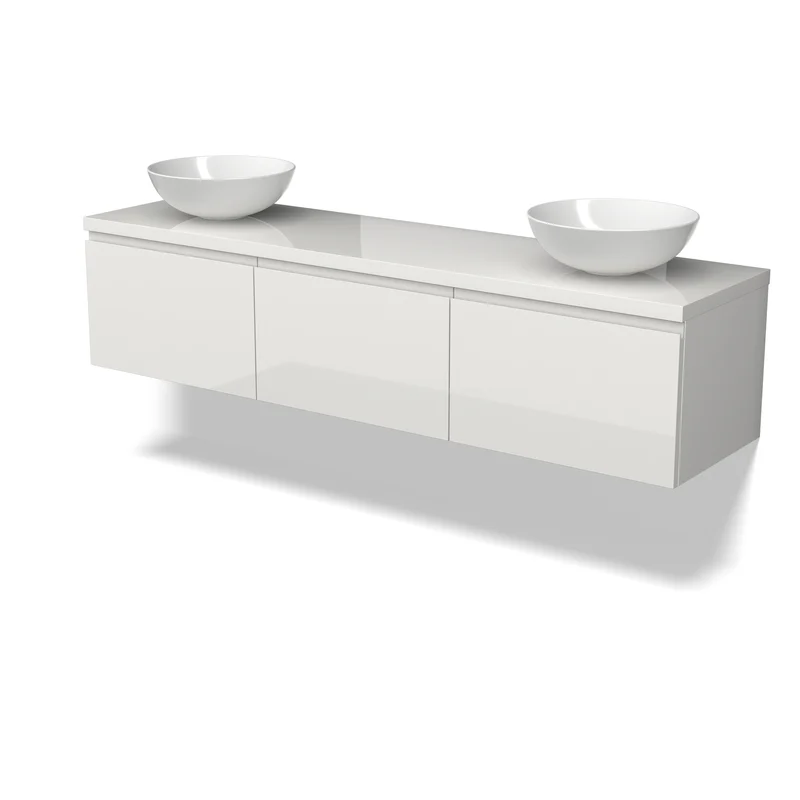 Modulo Plato Badmöbel mit Aufsatzwaschbecken | 180 cm Hochglanz Weiß Grifflos front Hochglanz Weiß blatt 3 nebeneinanderliegende Schubladen