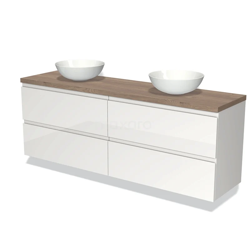 Modulo Plato Badmöbel mit Aufsatzwaschbecken | 180 cm Hochglanz Weiß Grifflos front Mittelbraune Eiche blatt 4 Schubladen