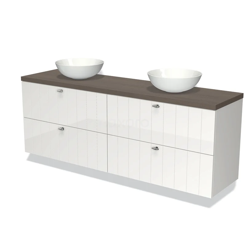 Modulo Plato Badmöbel mit Aufsatzwaschbecken | 180 cm Hochglanz Weiß Lamelle front Dunkelbraune Eiche blatt 4 Schubladen