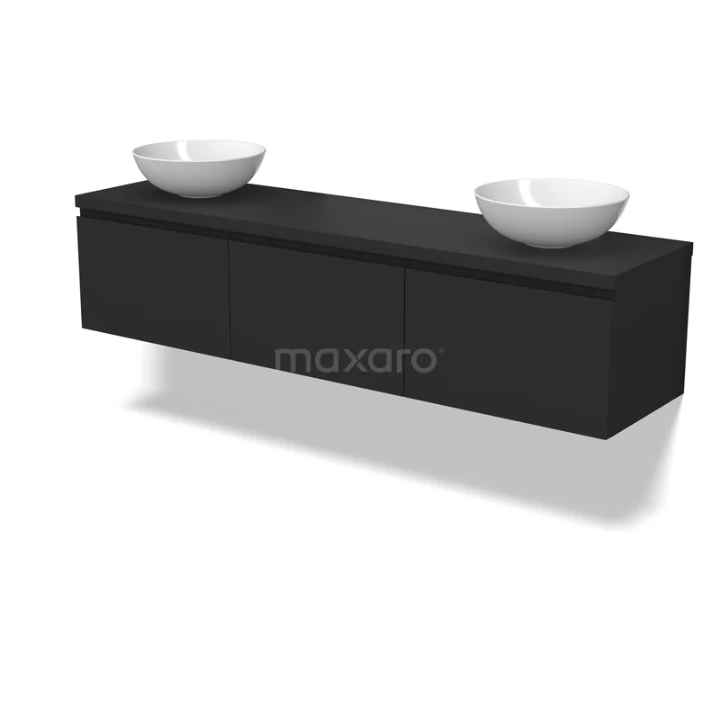 Modulo Plato Badmöbel mit Aufsatzwaschbecken | 180 cm Matt Schwarz Grifflos front Matt Schwarz blatt 3 nebeneinanderliegende Schubladen