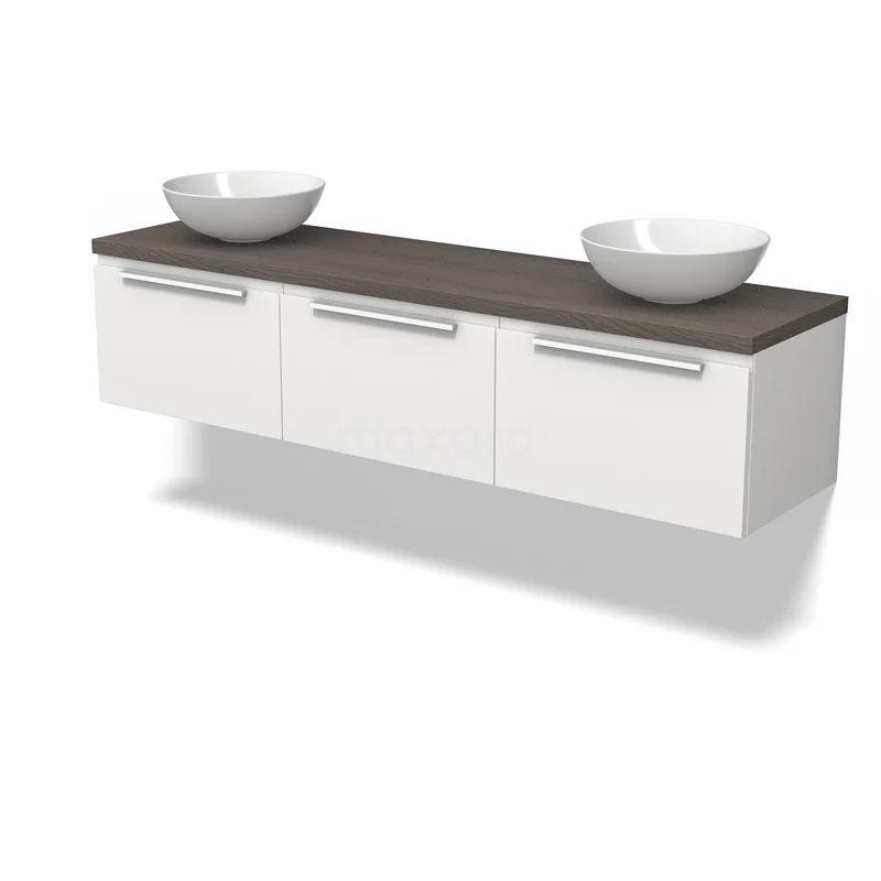 Modulo Plato Badmöbel mit Aufsatzwaschbecken | 180 cm Matt Weiß Flach front Dunkelbraune Eiche blatt 3 nebeneinanderliegende Schubladen