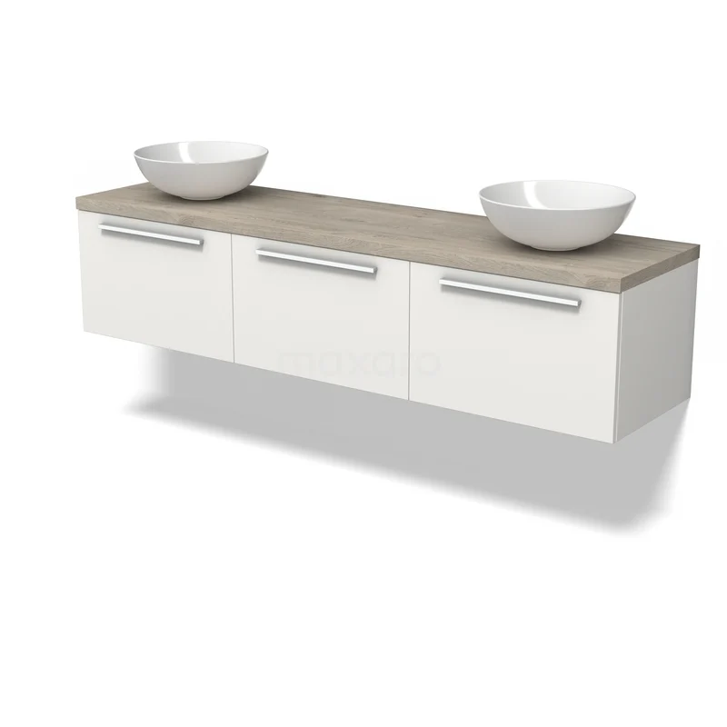 Modulo Plato Badmöbel mit Aufsatzwaschbecken | 180 cm Matt Weiß Flach front Hellgraue Eiche blatt 3 nebeneinanderliegende Schubladen
