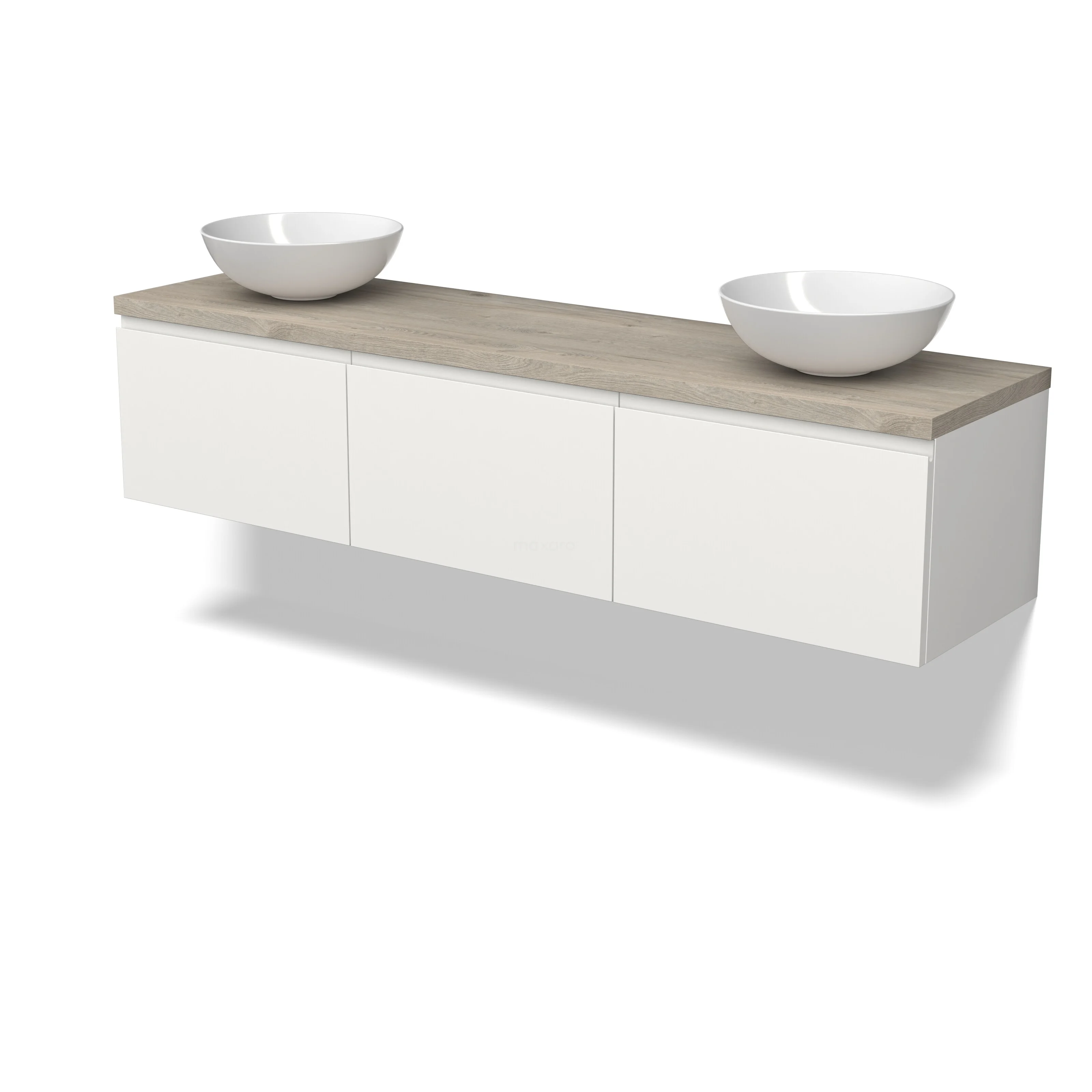 Modulo Plato Badmöbel mit Aufsatzwaschbecken | 180 cm Matt Weiß Grifflos front Hellgraue Eiche blatt 3 nebeneinanderliegende Schubladen