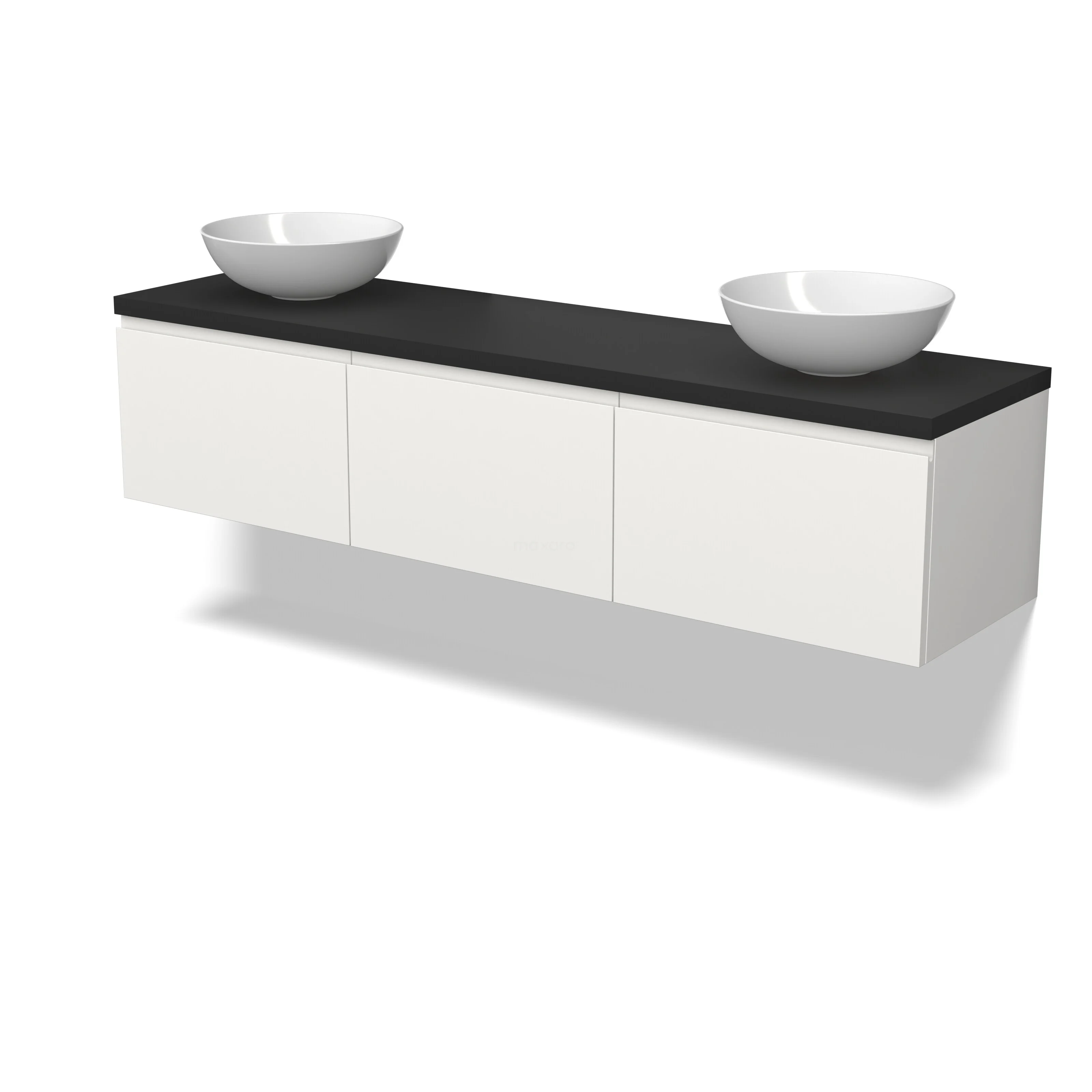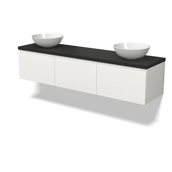 Modulo Plato Badmöbel mit Aufsatzwaschbecken | 180 cm Matt Weiß Grifflos front Matt Schwarz blatt 3 nebeneinanderliegende Schubladen