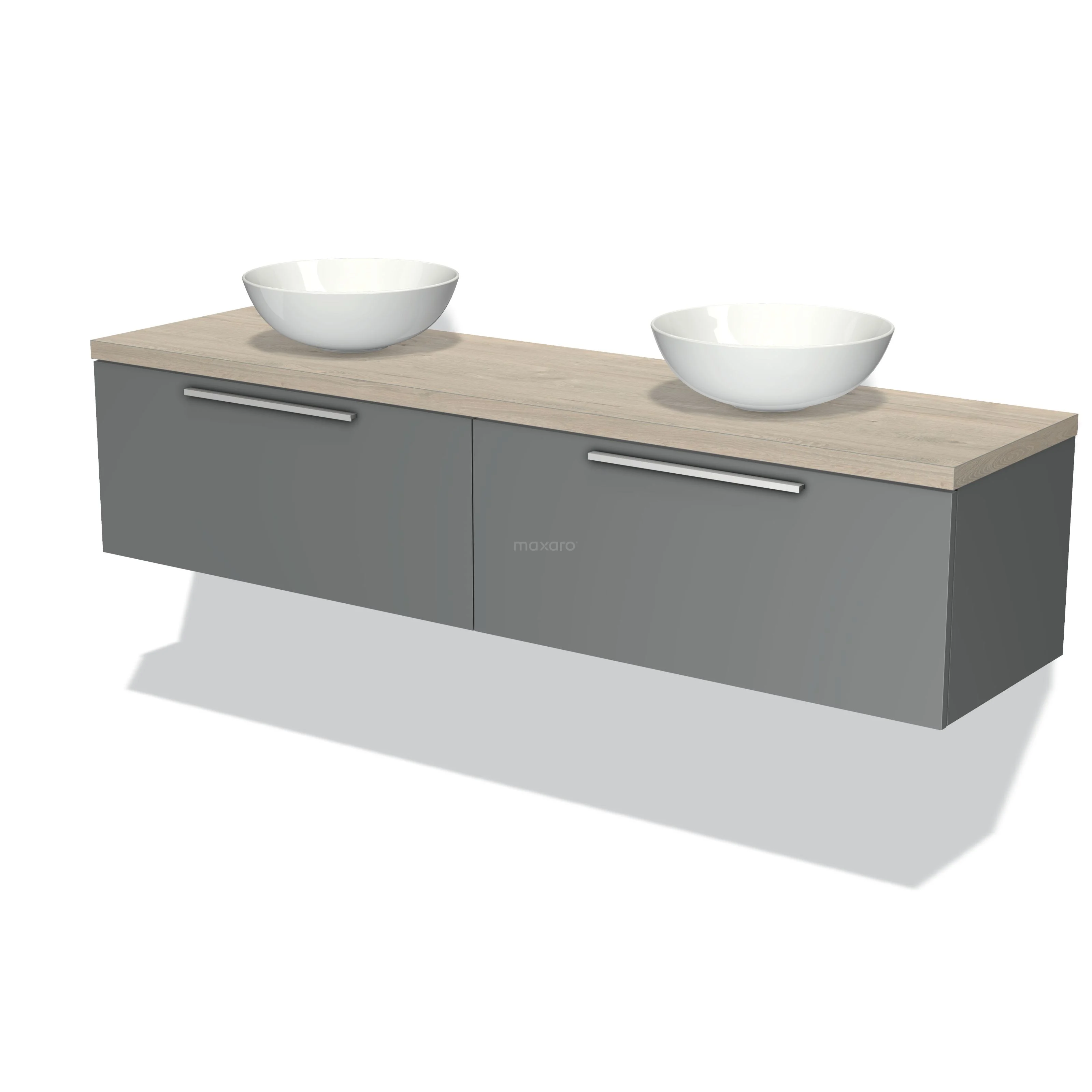 Modulo Plato Badmöbel mit Aufsatzwaschbecken | 180 cm Mittelgrau Flach front Hellgraue Eiche blatt 2 nebeneinanderliegende Schubladen