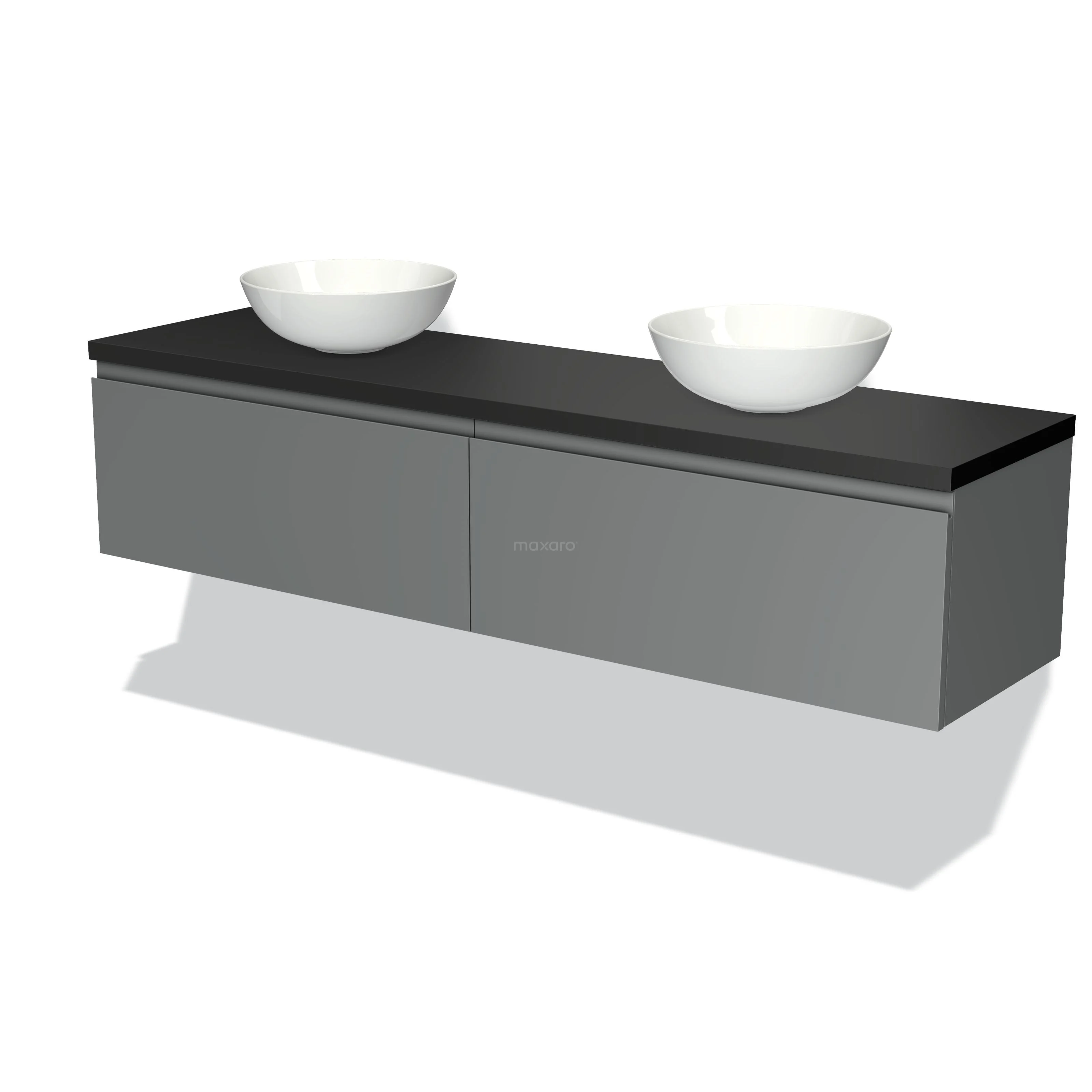 Modulo Plato Badmöbel mit Aufsatzwaschbecken | 180 cm Mittelgrau Grifflos front Matt Schwarz blatt 2 nebeneinanderliegende Schubladen