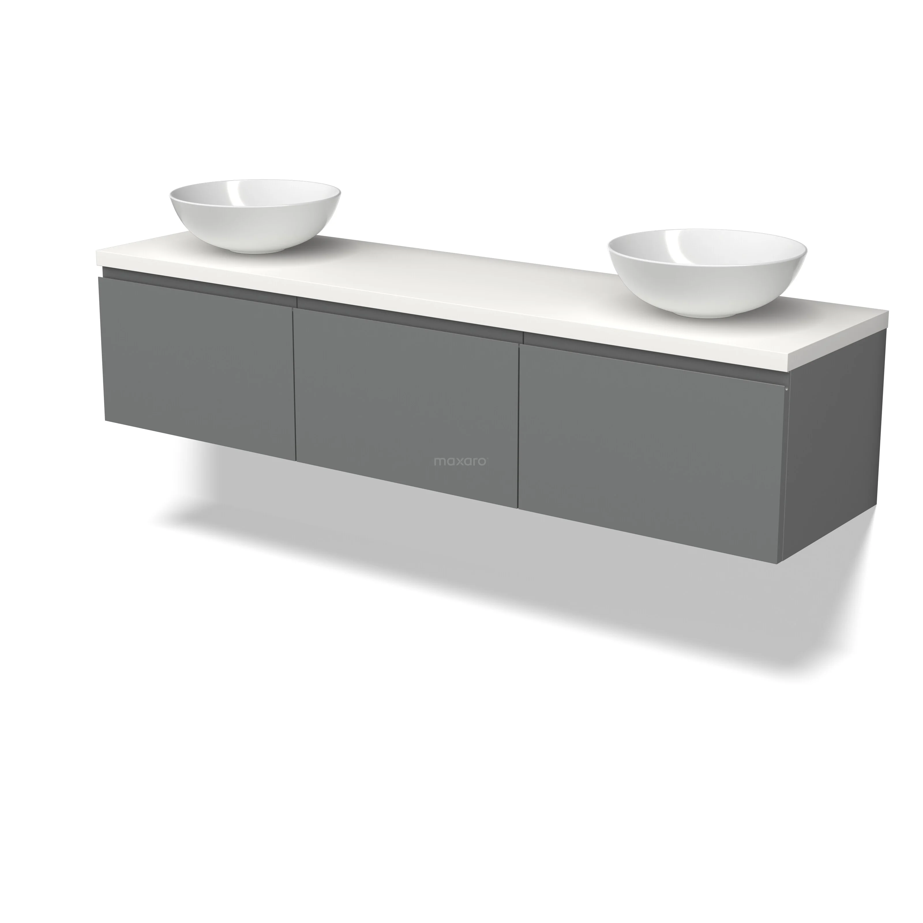 Modulo Plato Badmöbel mit Aufsatzwaschbecken | 180 cm Mittelgrau Grifflos front Matt Weiß blatt 3 nebeneinanderliegende Schubladen
