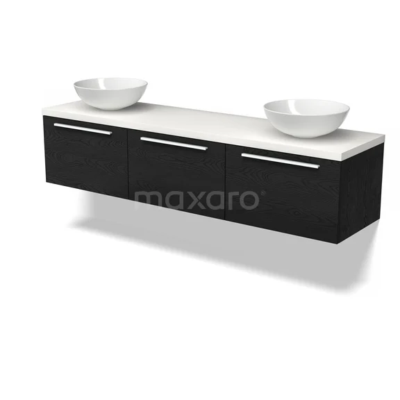 Modulo Plato Badmöbel mit Aufsatzwaschbecken | 180 cm Schwarze Eiche Flach front Matt Weiß blatt 3 nebeneinanderliegende Schubladen