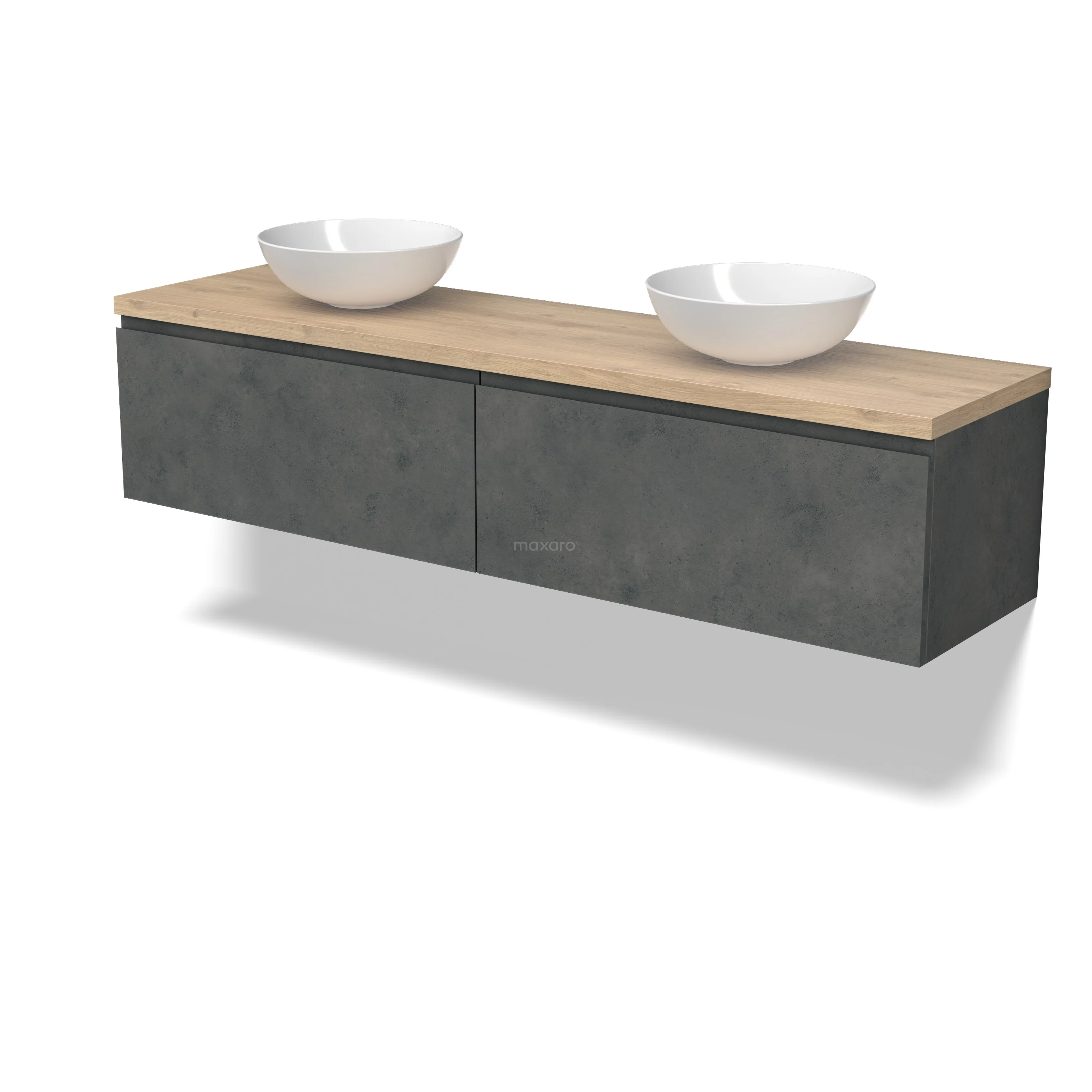 Modulo Plato Badmöbel mit Aufsatzwaschbecken | 200 cm Dunkelgrauer Beton Grifflos front Hellbraune Eiche blatt 2 nebeneinanderliegende Schubladen