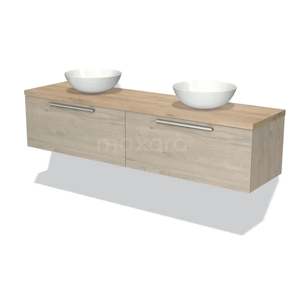 Modulo Plato Badmöbel mit Aufsatzwaschbecken | 200 cm Hellgraue Eiche Flach front Hellbraune Eiche blatt 2 nebeneinanderliegende Schubladen