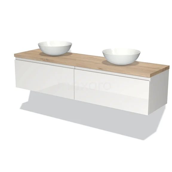 Modulo Plato Badmöbel mit Aufsatzwaschbecken | 200 cm Hochglanz Weiß Grifflos front Hellbraune Eiche blatt 2 nebeneinanderliegende Schubladen