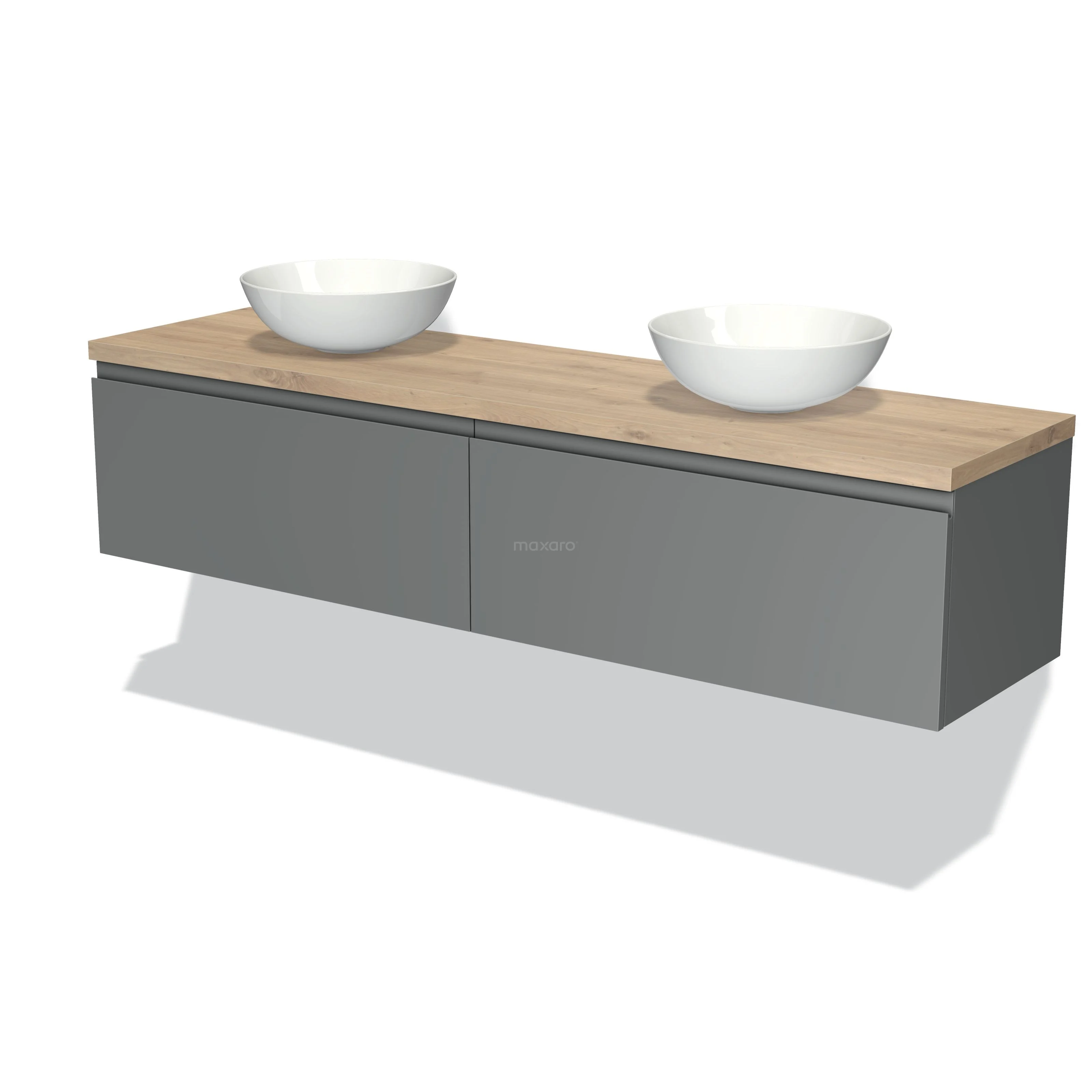 Modulo Plato Badmöbel mit Aufsatzwaschbecken | 200 cm Mittelgrau Grifflos front Hellbraune Eiche blatt 2 nebeneinanderliegende Schubladen