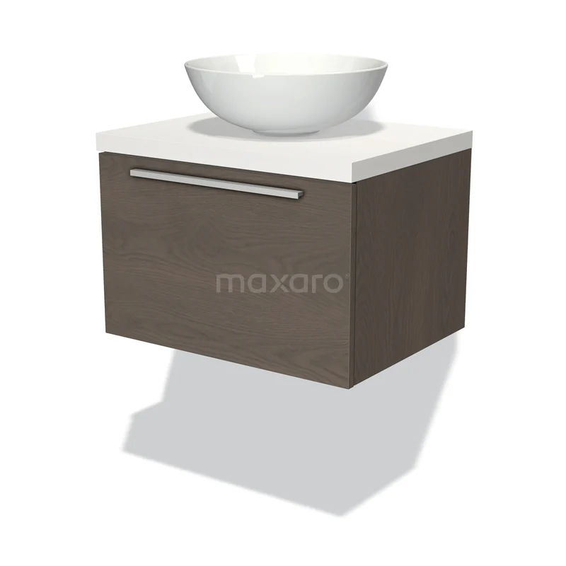 Modulo Plato Badmöbel mit Aufsatzwaschbecken | 60 cm Dunkelbraune Eiche Flach front Matt Weiß blatt 1 Schublade