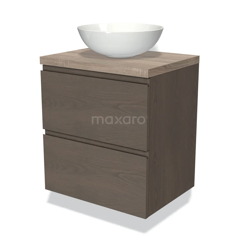 Modulo Plato Badmöbel mit Aufsatzwaschbecken | 60 cm Dunkelbraune Eiche Grifflos front Eiche blatt 2 übereinanderliegende Schubladen