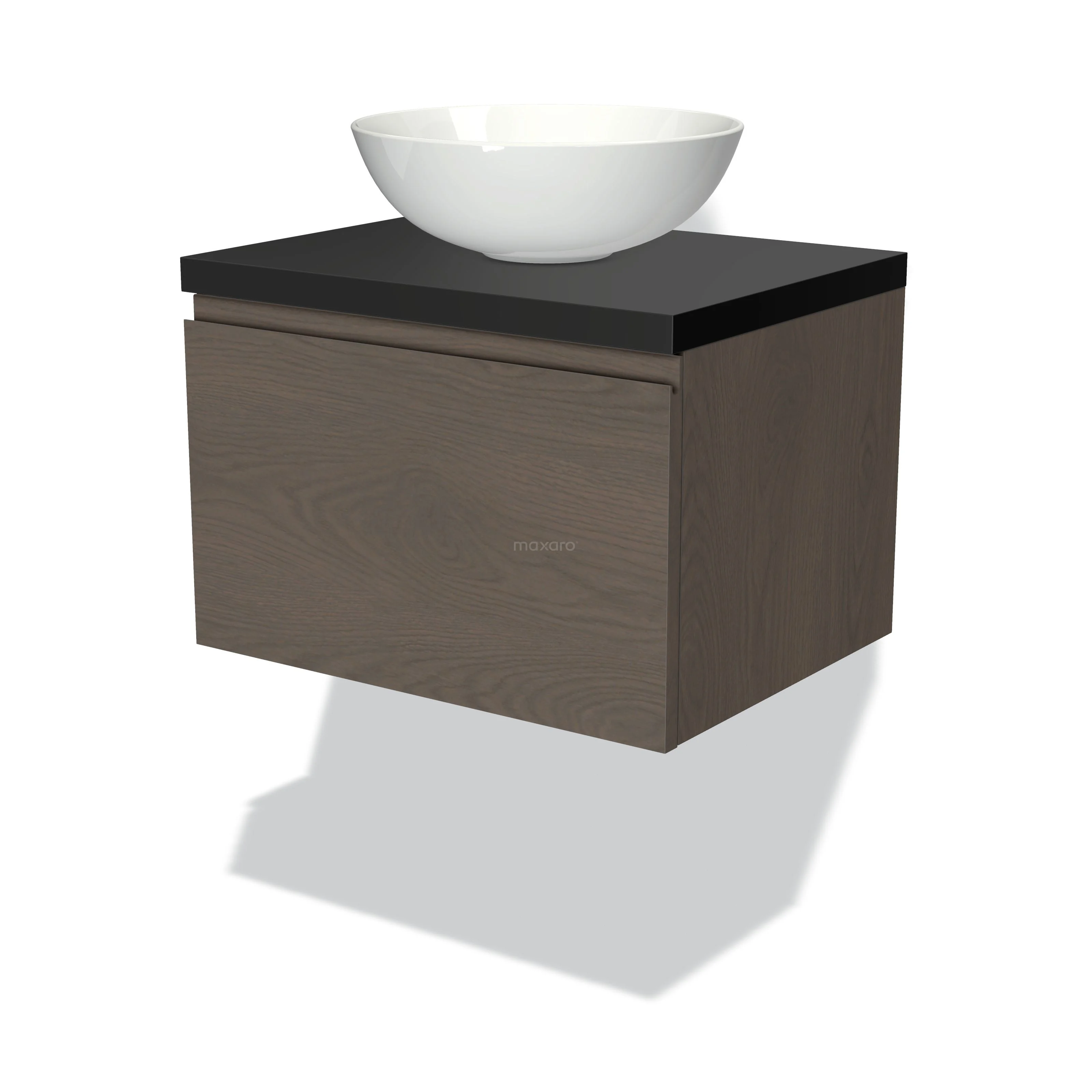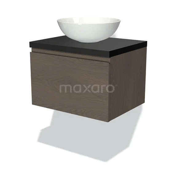 Modulo Plato Badmöbel mit Aufsatzwaschbecken | 60 cm Dunkelbraune Eiche Grifflos front Matt Schwarz blatt 1 Schublade