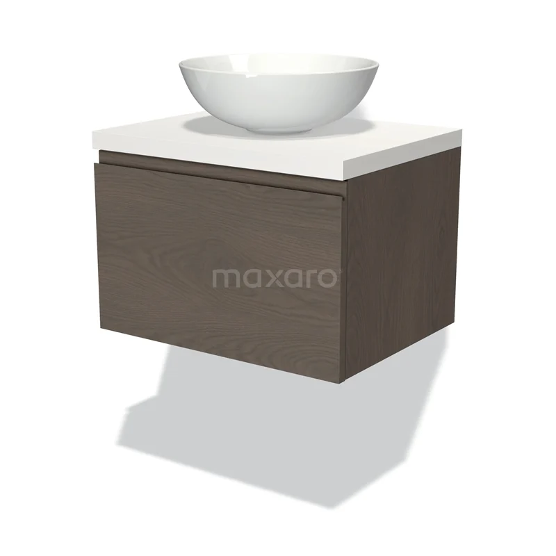 Modulo Plato Badmöbel mit Aufsatzwaschbecken | 60 cm Dunkelbraune Eiche Grifflos front Matt Weiß blatt 1 Schublade