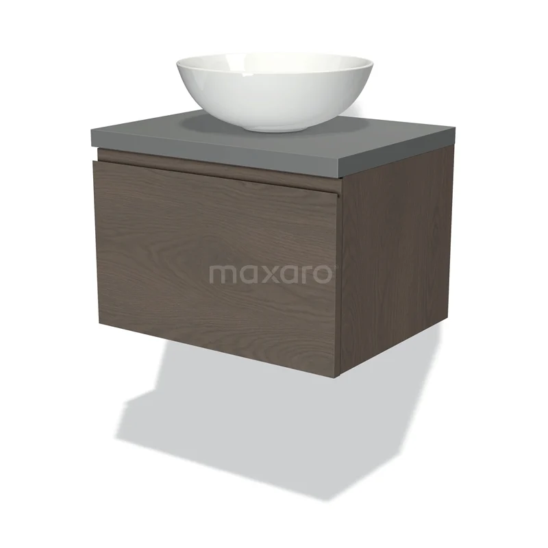 Modulo Plato Badmöbel mit Aufsatzwaschbecken | 60 cm Dunkelbraune Eiche Grifflos front Mittelgrau blatt 1 Schublade