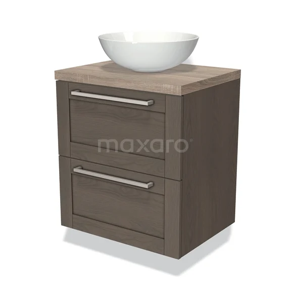 Modulo Plato Badmöbel mit Aufsatzwaschbecken | 60 cm Dunkelbraune Eiche Rahmen front Eiche blatt 2 übereinanderliegende Schubladen