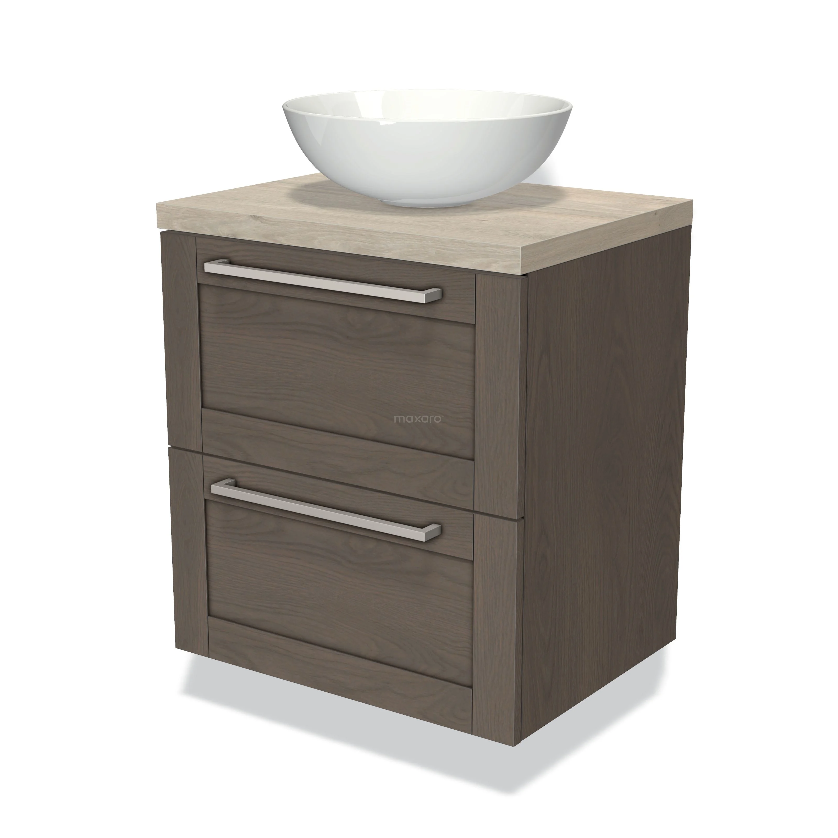 Modulo Plato Badmöbel mit Aufsatzwaschbecken | 60 cm Dunkelbraune Eiche Rahmen front Hellgraue Eiche blatt 2 übereinanderliegende Schubladen