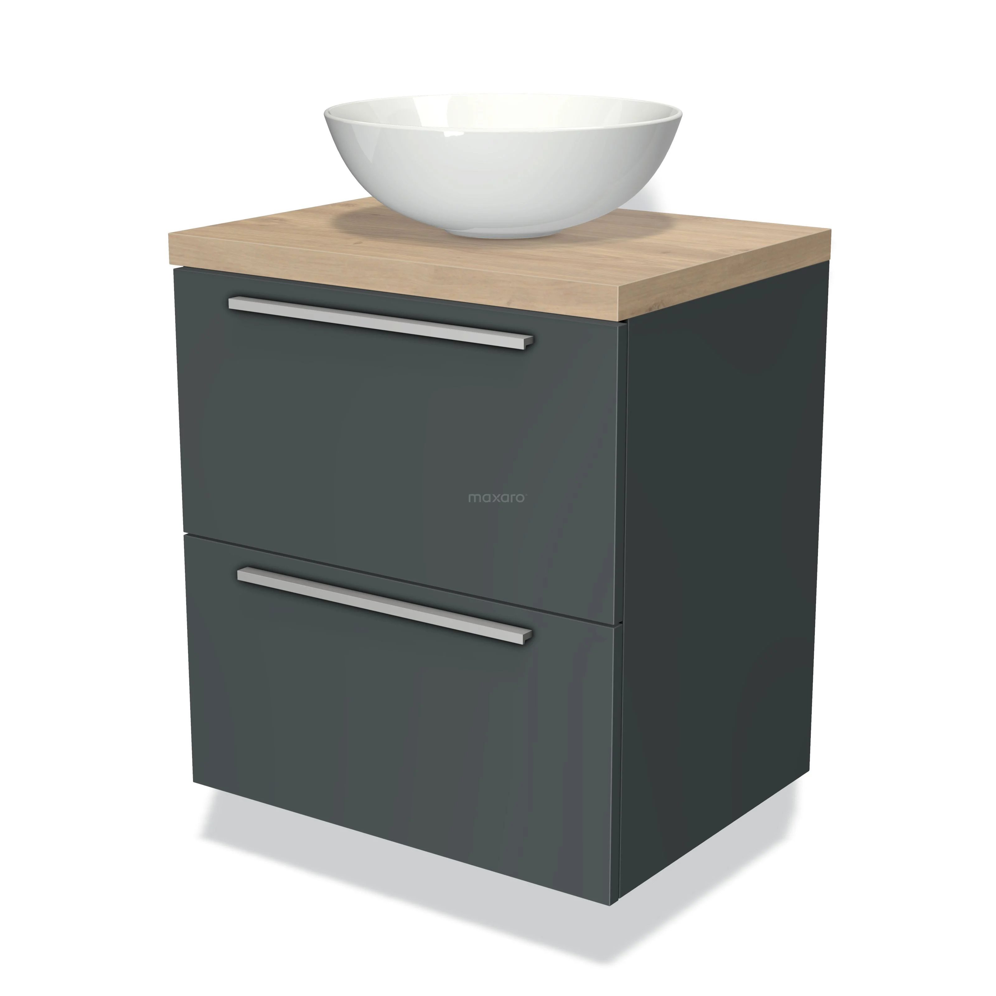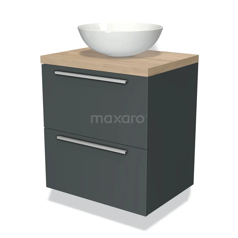 Modulo Plato Badmöbel mit Aufsatzwaschbecken | 60 cm Dunkelgrau Flach front Hellbraune Eiche blatt 2 übereinanderliegende Schubladen