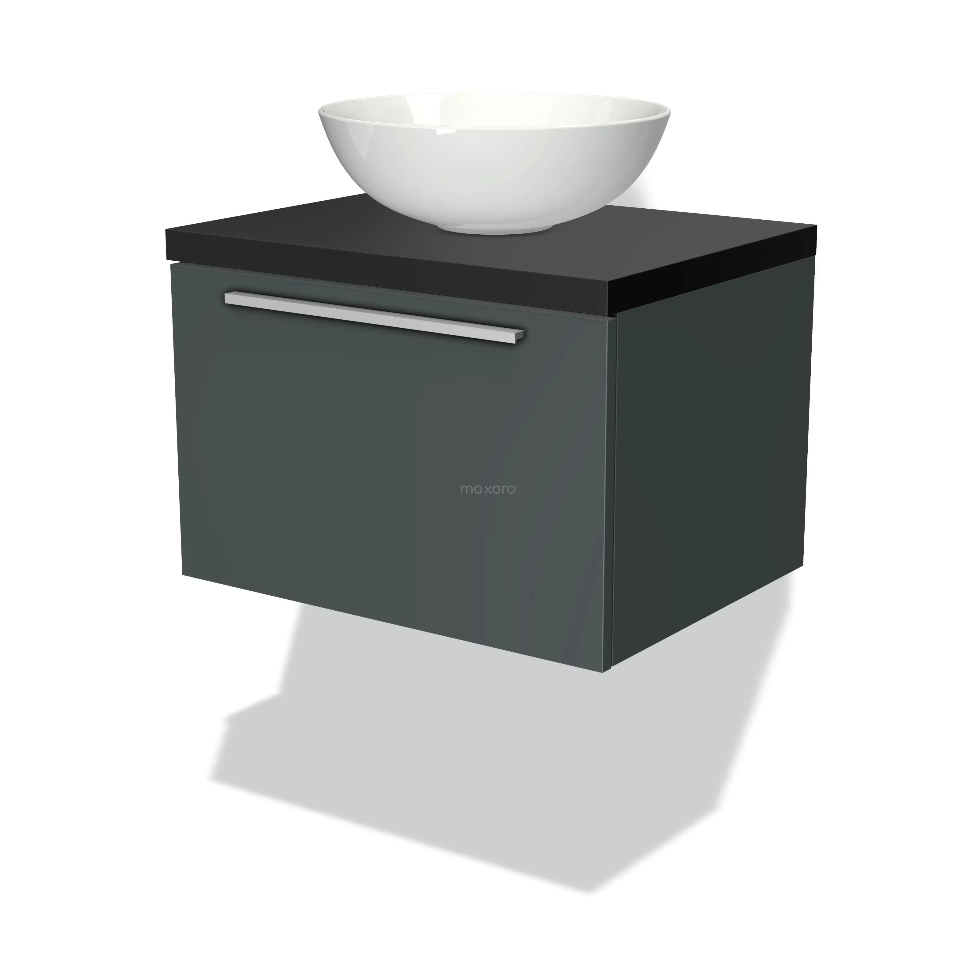 Modulo Plato Badmöbel mit Aufsatzwaschbecken | 60 cm Dunkelgrau Flach front Matt Schwarz blatt 1 Schublade