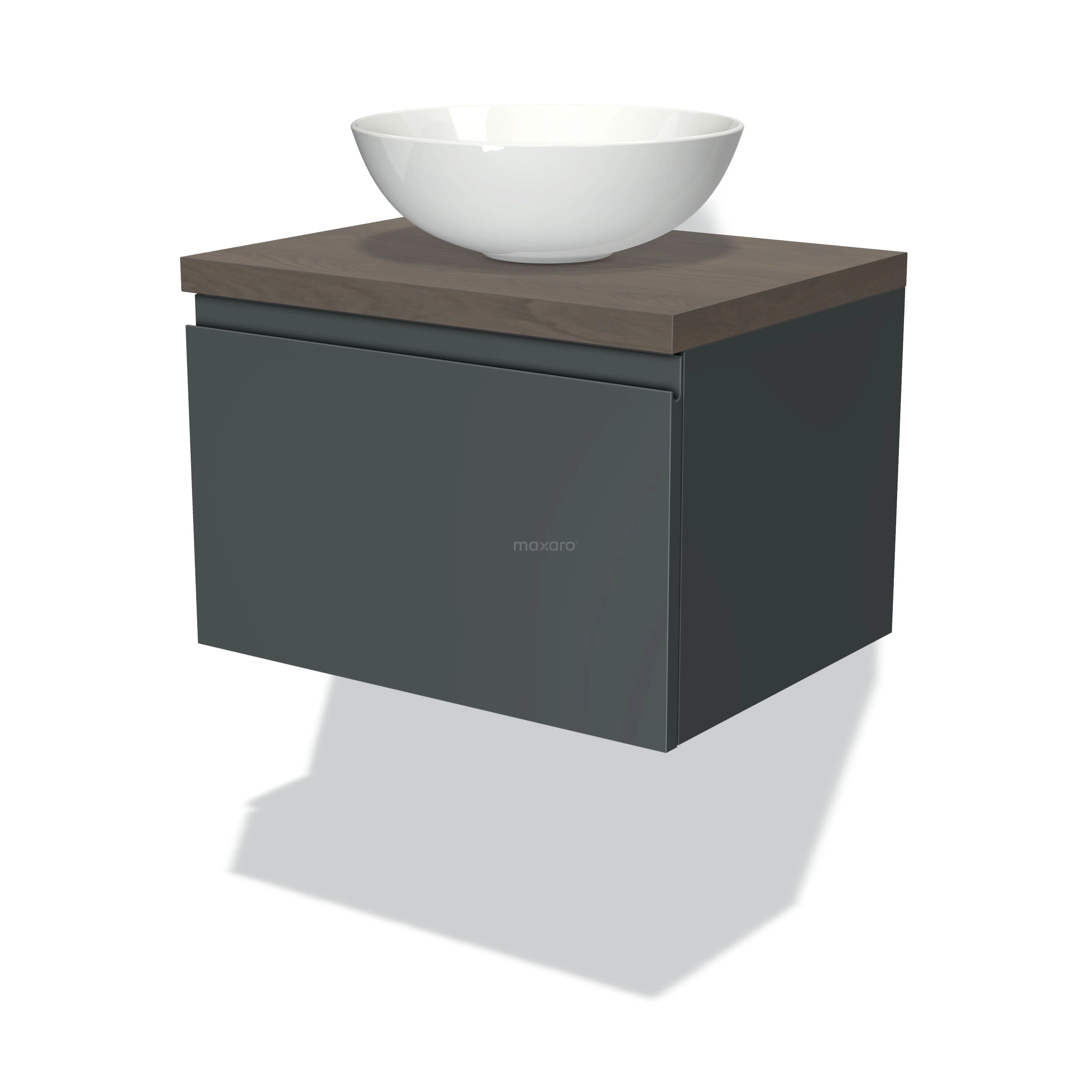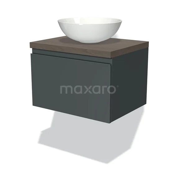 Modulo Plato Badmöbel mit Aufsatzwaschbecken | 60 cm Dunkelgrau Grifflos front Dunkelbraune Eiche blatt 1 Schublade