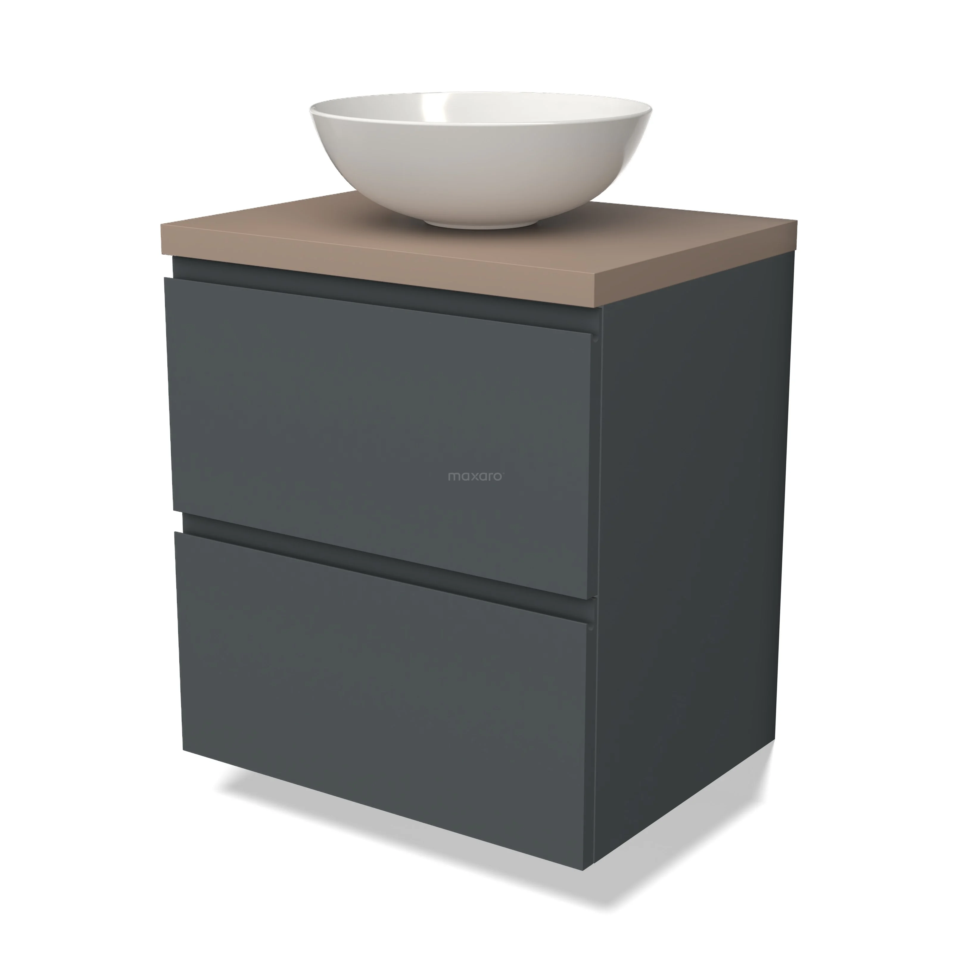 Modulo Plato Badmöbel mit Aufsatzwaschbecken | 60 cm Dunkelgrau Grifflos front Taupe blatt 2 übereinanderliegende Schubladen