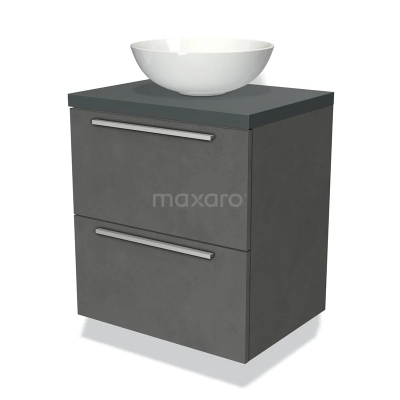 Modulo Plato Badmöbel mit Aufsatzwaschbecken | 60 cm Dunkelgrauer Beton Flach front Dunkelgrau blatt 2 übereinanderliegende Schubladen