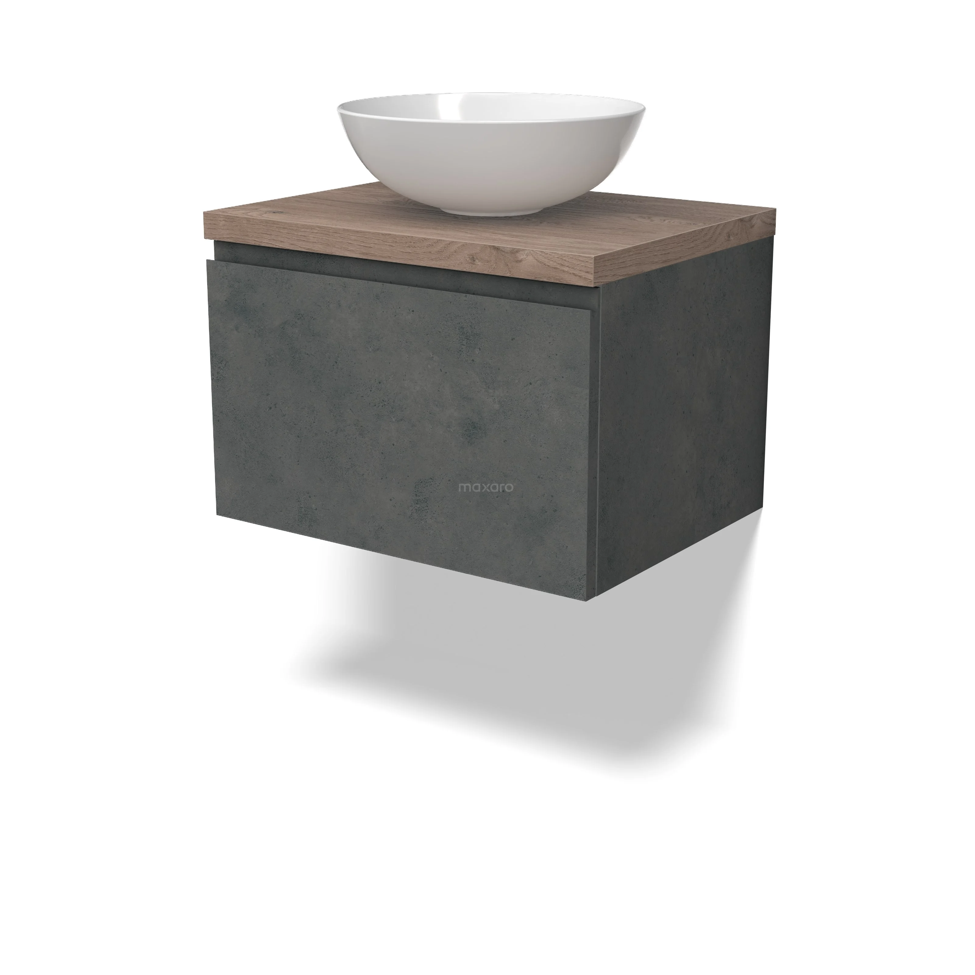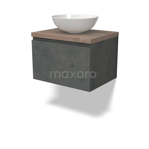 Modulo Plato Badmöbel mit Aufsatzwaschbecken | 60 cm Dunkelgrauer Beton Grifflos front Mittelbraune Eiche blatt 1 Schublade
