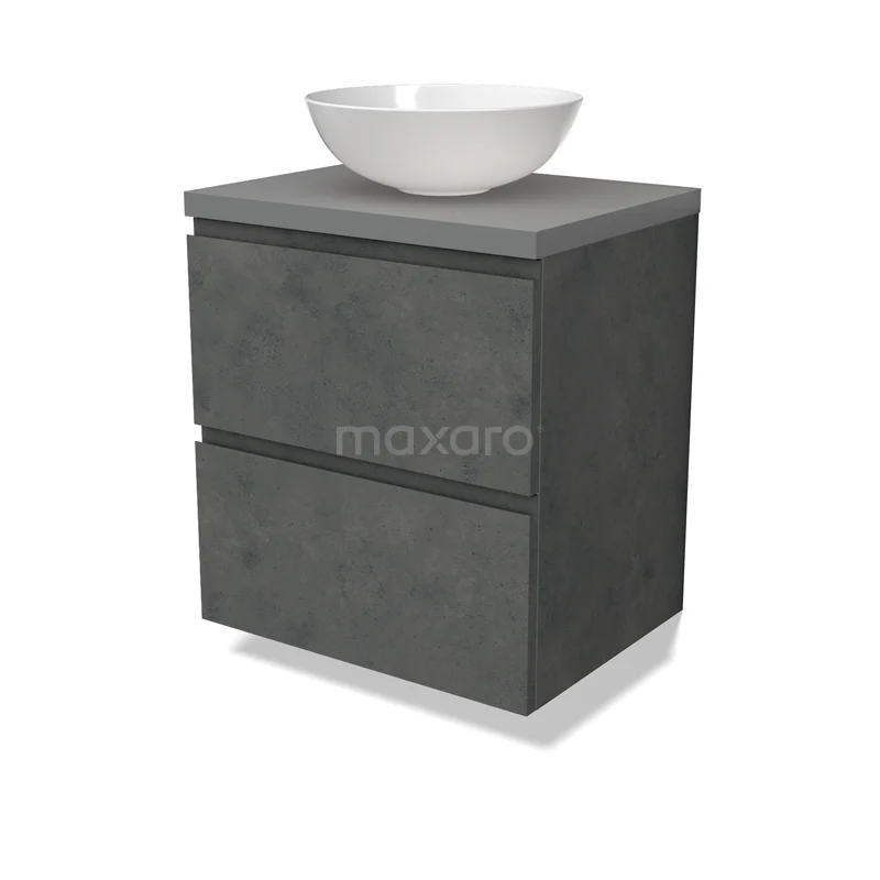 Modulo Plato Badmöbel mit Aufsatzwaschbecken | 60 cm Dunkelgrauer Beton Grifflos front Mittelgrau blatt 2 übereinanderliegende Schubladen