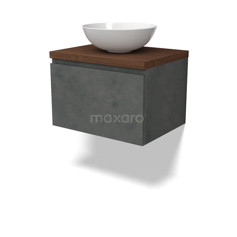 Modulo Plato Badmöbel mit Aufsatzwaschbecken | 60 cm Dunkelgrauer Beton Grifflos front Walnuss blatt 1 Schublade