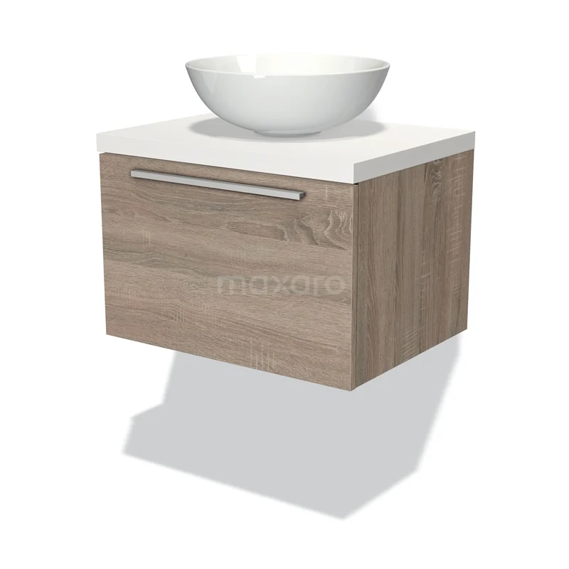 Modulo Plato Badmöbel mit Aufsatzwaschbecken | 60 cm Eiche Flach front Matt Weiß blatt 1 Schublade