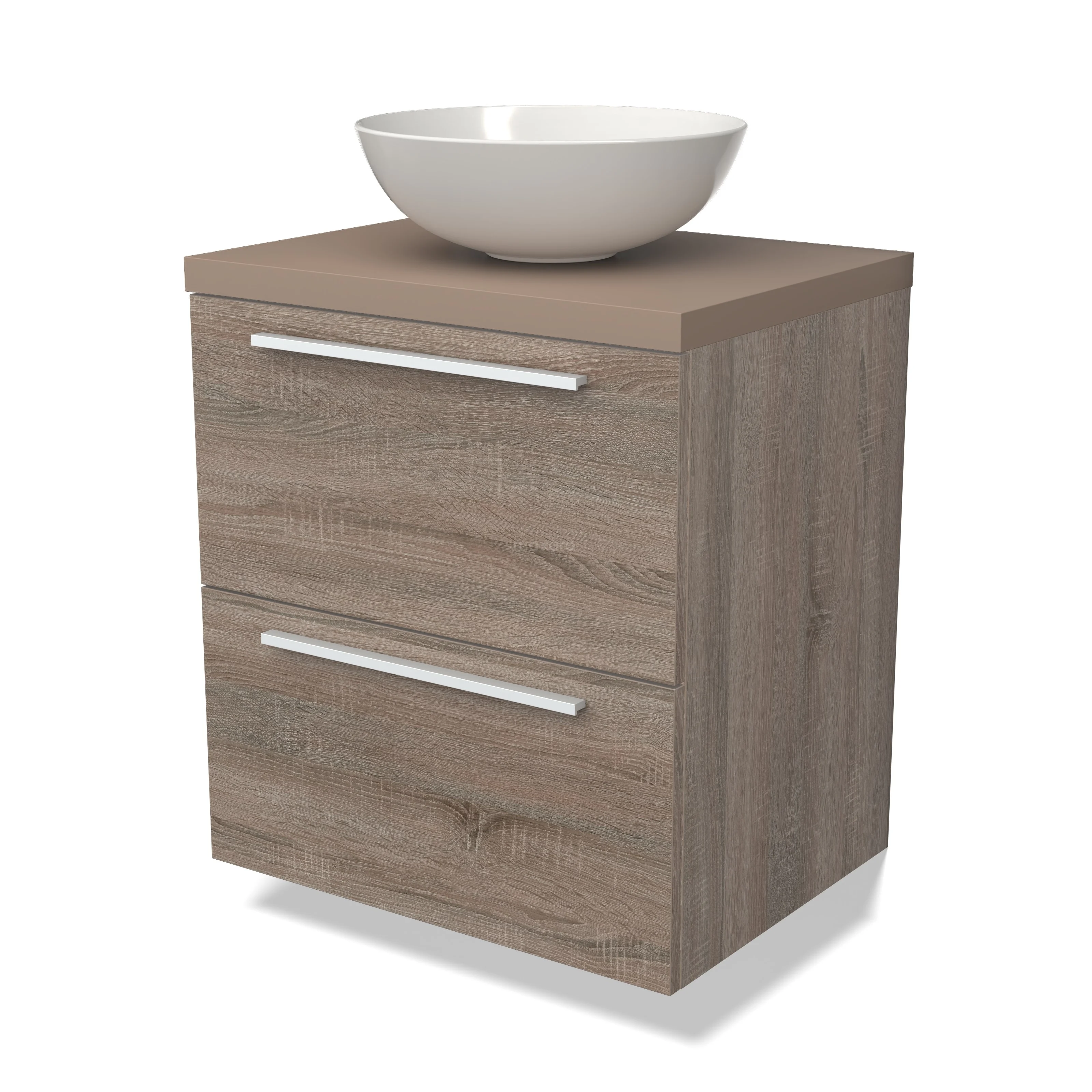 Modulo Plato Badmöbel mit Aufsatzwaschbecken | 60 cm Eiche Flach front Taupe blatt 2 übereinanderliegende Schubladen