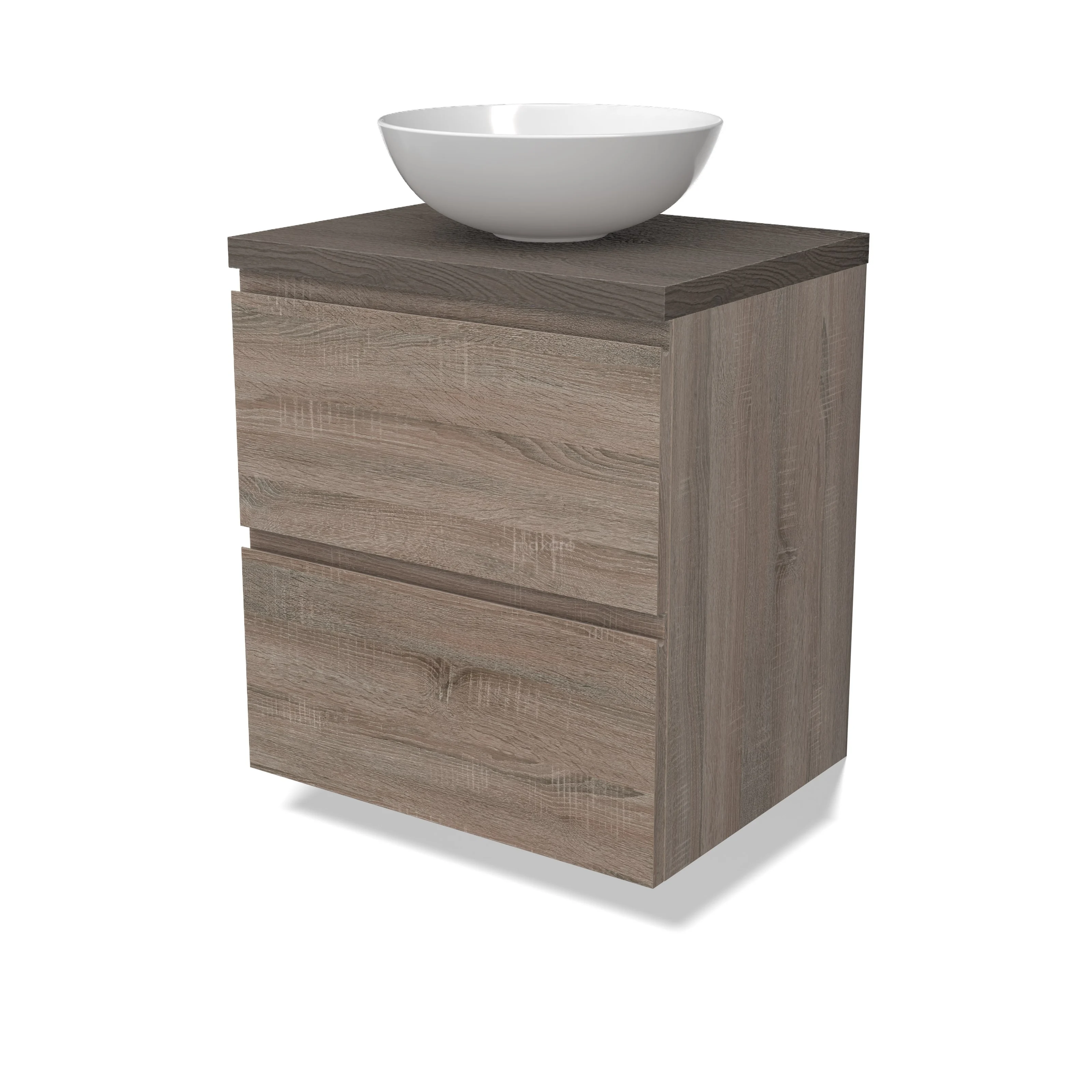 Modulo Plato Badmöbel mit Aufsatzwaschbecken | 60 cm Eiche Grifflos front Dunkelbraune Eiche blatt 2 übereinanderliegende Schubladen