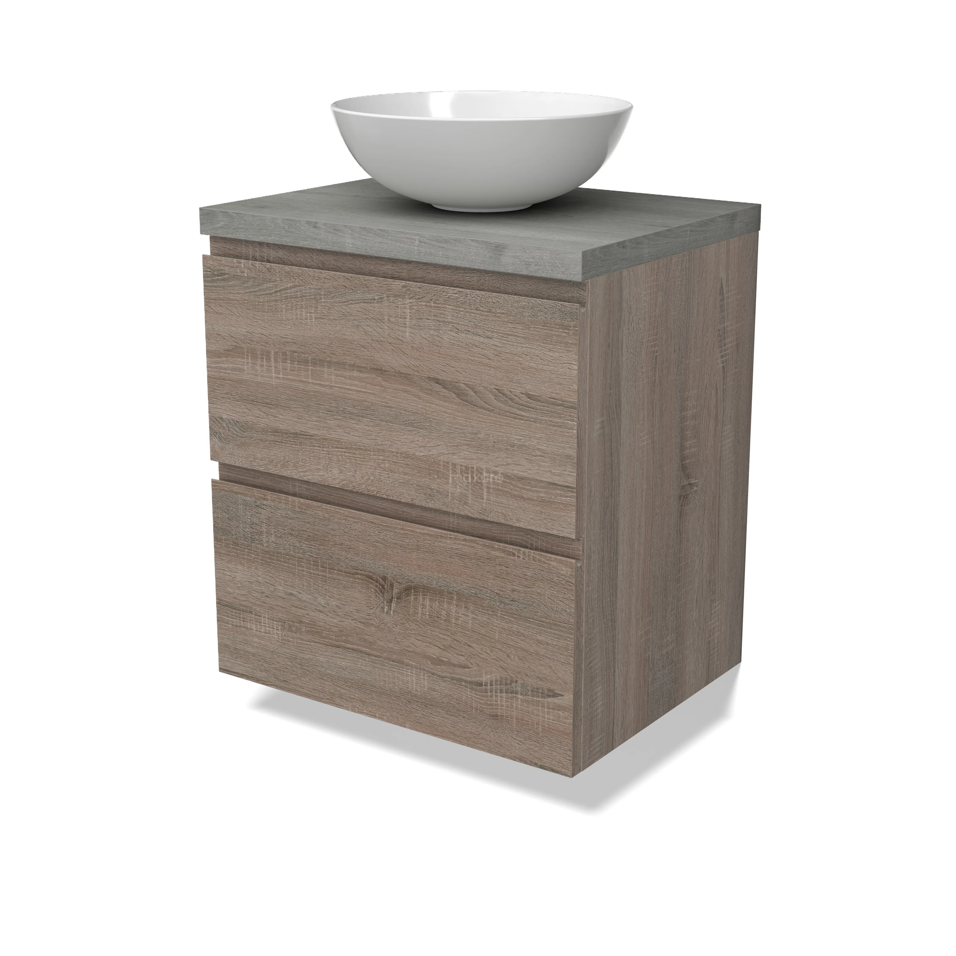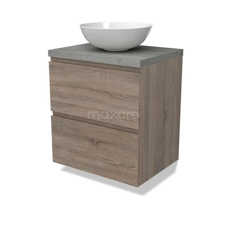 Modulo Plato Badmöbel mit Aufsatzwaschbecken | 60 cm Eiche Grifflos front Graue Eiche blatt 2 übereinanderliegende Schubladen