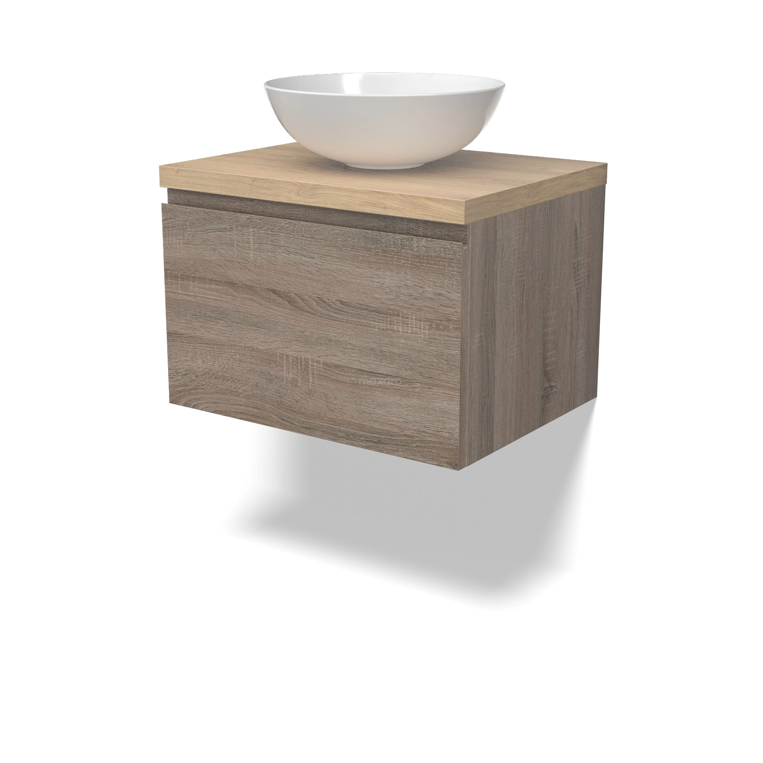 Modulo Plato Badmöbel mit Aufsatzwaschbecken | 60 cm Eiche Grifflos front Hellbraune Eiche blatt 1 Schublade