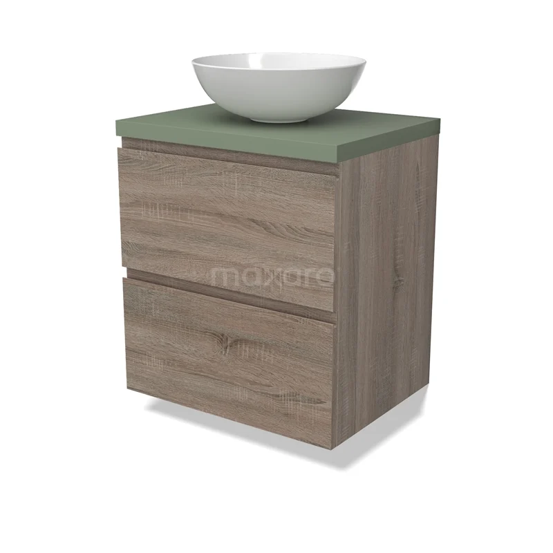 Modulo Plato Badmöbel mit Aufsatzwaschbecken | 60 cm Eiche Grifflos front Salbeigrün blatt 2 übereinanderliegende Schubladen