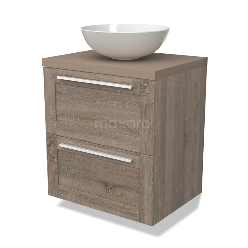 Modulo Plato Badmöbel mit Aufsatzwaschbecken | 60 cm Eiche Rahmen front Taupe blatt 2 übereinanderliegende Schubladen