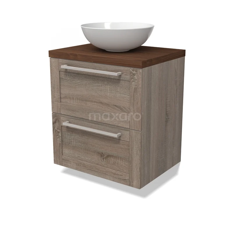Modulo Plato Badmöbel mit Aufsatzwaschbecken | 60 cm Eiche Rahmen front Walnuss blatt 2 übereinanderliegende Schubladen